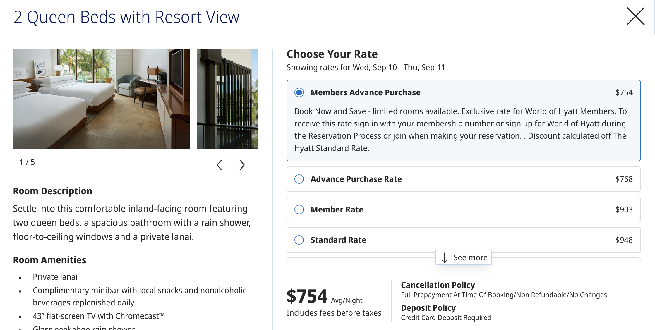 I used two 85K free-night certificates for the Marriott Wailea Beach Resort. One came from my Marriott Bonvoy Brilliant® American Express® Card and one from my Ritz-Carlton™ card (which is available only as through a product change). This hotel would cost about $800 per night to book as a cash stay. As a Marriott Bonvoy® Platinum Elite member, I receive a bonus of five Nightly Upgrade Awards every year. I applied one to each of these nights in hopes of getting a suite.