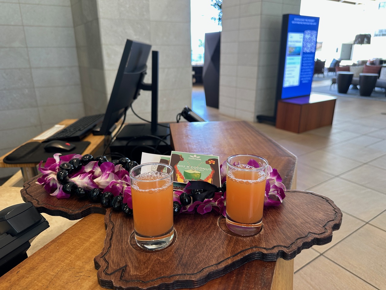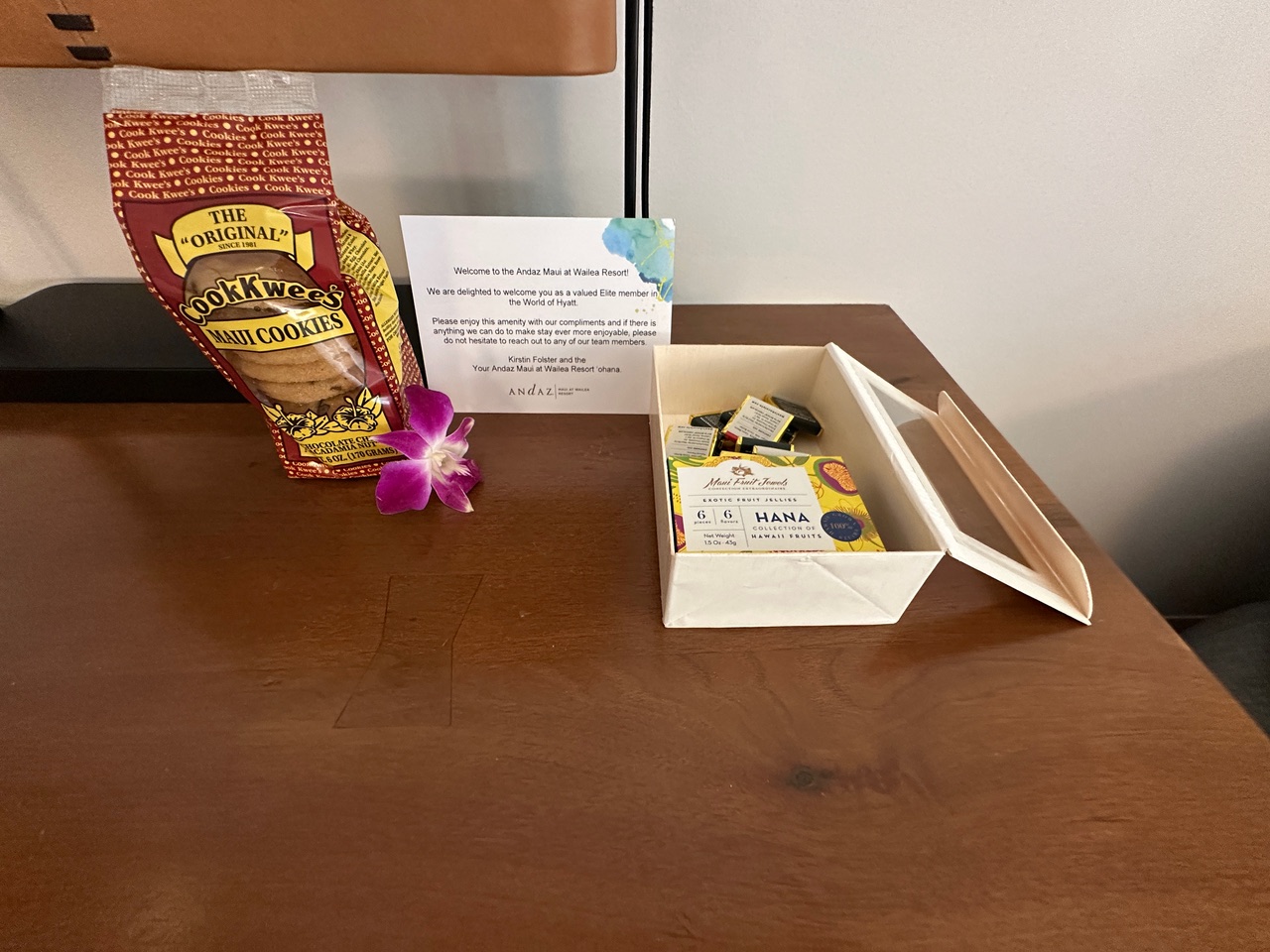 Unfortunately, we did not get an upgrade at this hotel. Our garden-view standard rooms featured two queen beds and were quite spacious, complete with a good-sized bathroom. Because it was an Andaz, we found daily treats in our free minibar area. This hotel had Hawaiian cookies, Maui chips, and a couple of drinks in the mini-fridge.