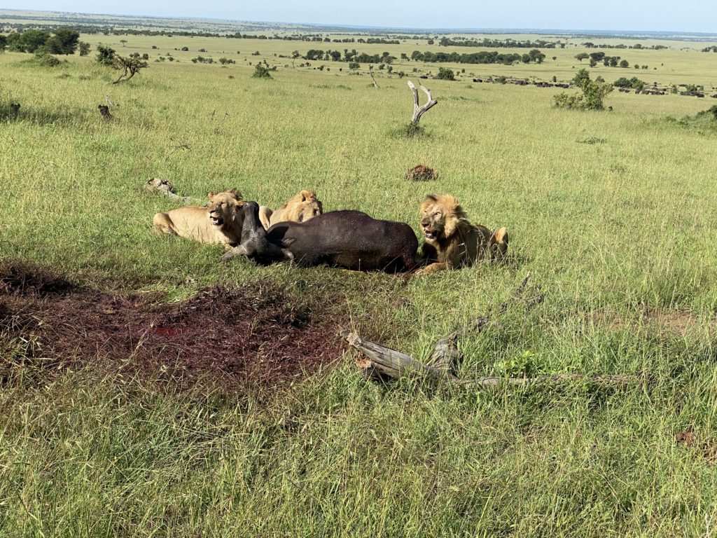 One day we heard some hyenas had attacked a Cape buffalo so we headed there. We found they had been chased off by 3 lions who were devouring this buffalo. I couldn’t believe how close we drove up to it. We were probably 15 feet from them. Honestly, I was a little uncomfortable especially when I found out that they didn’t have a gun or spear with them. They convinced me we were safe and that they can “read” the animals and knew when to retreat. I have to say, I was still nervous!