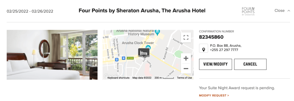 We arrived in Kilimanjaro, Tanzania on February 23rd and had to spend the night before our safari began. Using points to stay in Arusha which was about 25 minutes away from Kilimanjaro was great. The room cost us only 12,500 points and would have cost $206. Platinum Premier status got us free breakfast in the morning and our suite night request got us a suite.