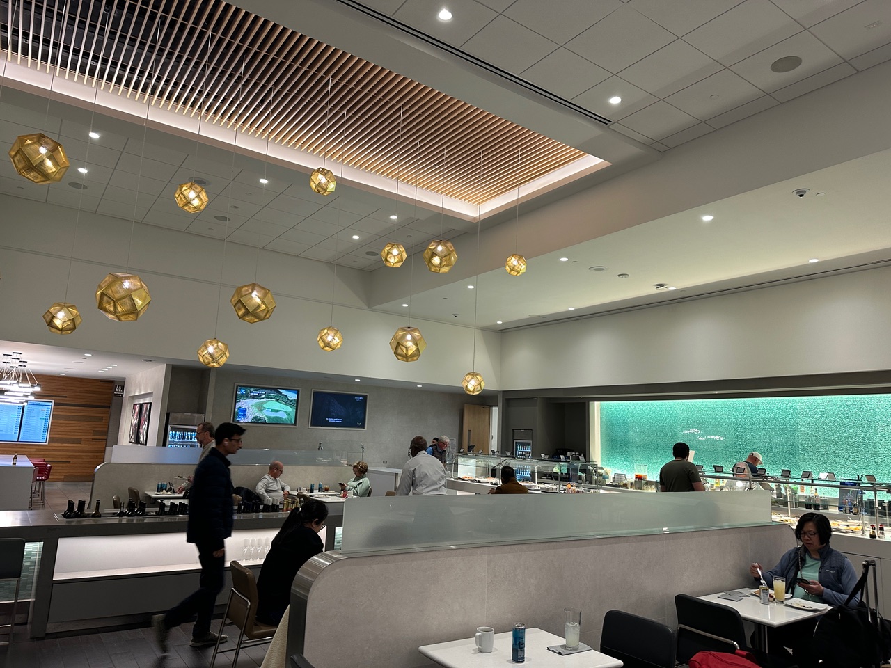 We started our trip at the Dallas Airport with not one but two lounges. First, we went to the AA Flagship Lounge, which is quite large but narrow. It had many great food options, but we didn’t try much. (If you’re flying American Airlines business class on qualifying flights (mostly long-haul international ones), you have access to this lounge.)