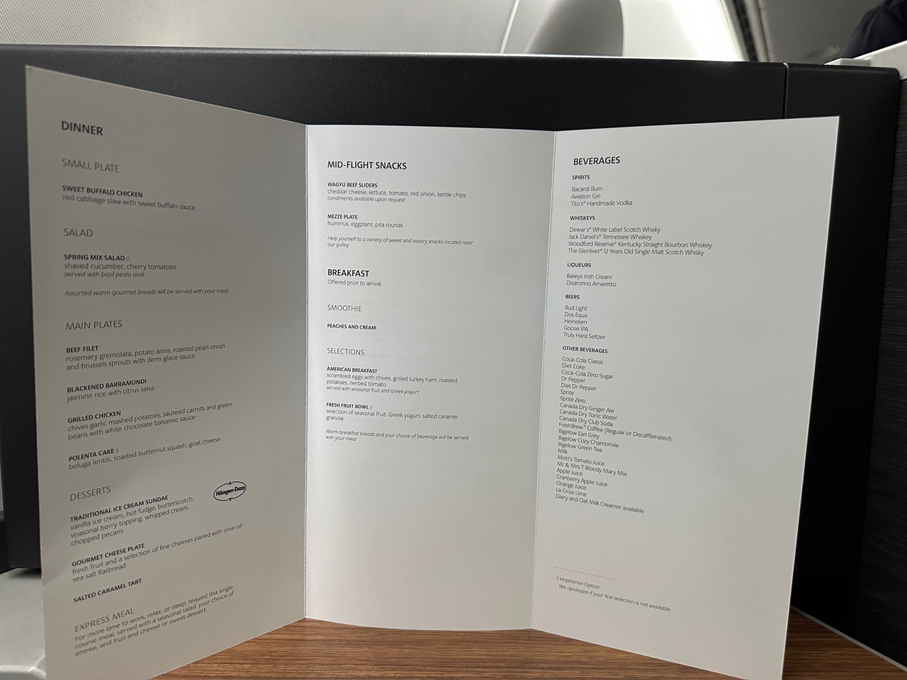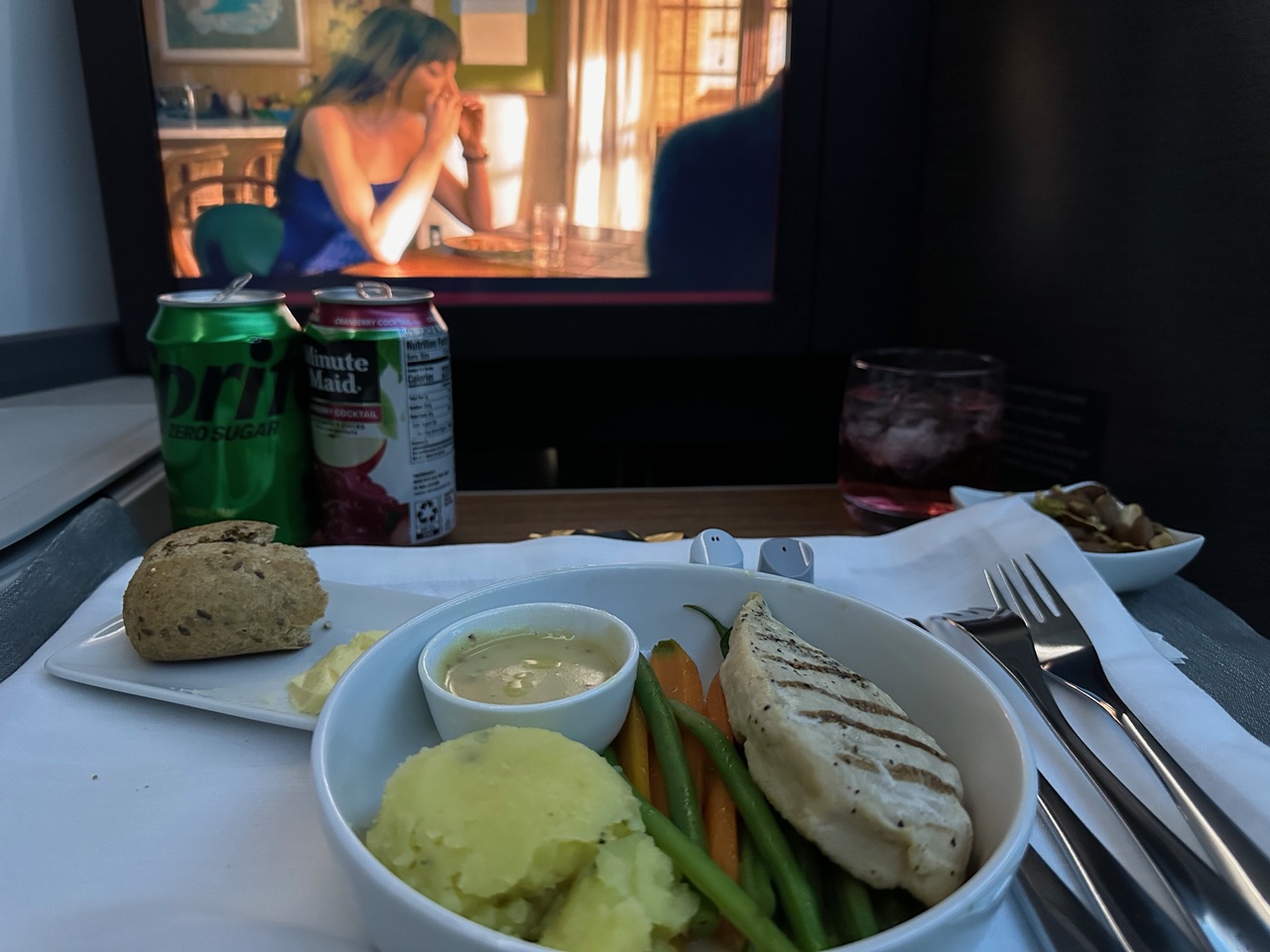 Service on the flight was good from start to finish. Before takeoff, the flight attendants offered champagne, orange juice, or water. They introduced themselves and took our orders for dinner. (You can order up to 30 days before the flight, but I forgot to.) However, the main options were all still available. Throughout the flight, the attendants were kind and attentive, offering to get us anything we wanted.