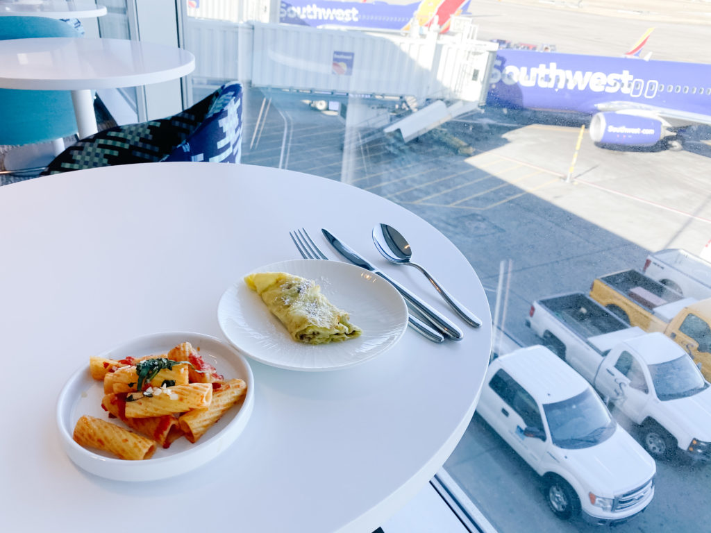 It is beautiful! In gorgeous blue and wood tones, it soothes and calms one senses. A huge window on one side opens up to showcase Southwest airplanes coming and going. I love the way it’s been decorated – probably my favorite American Express® Centurion® Lounge decor ever.