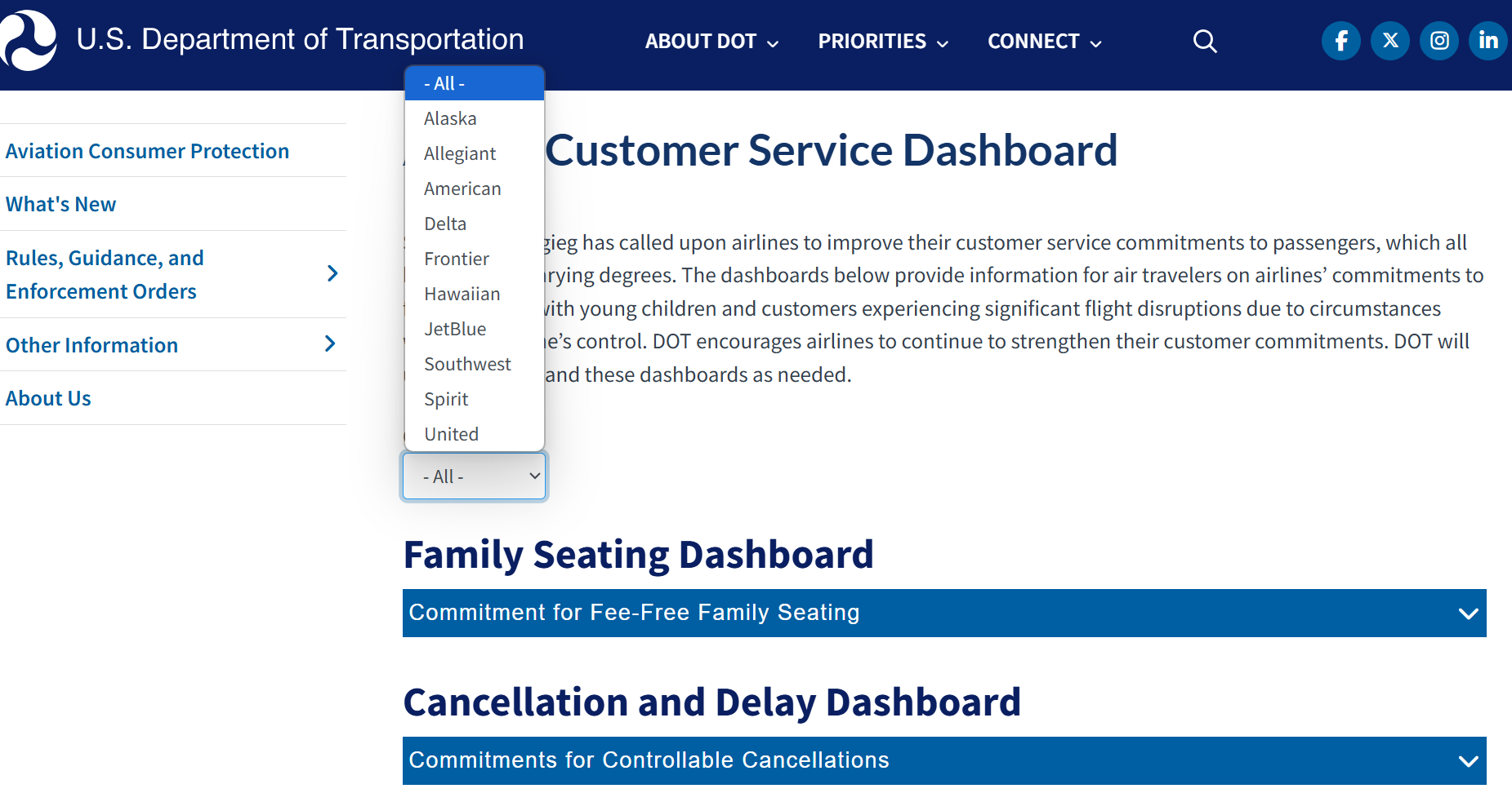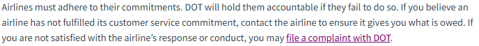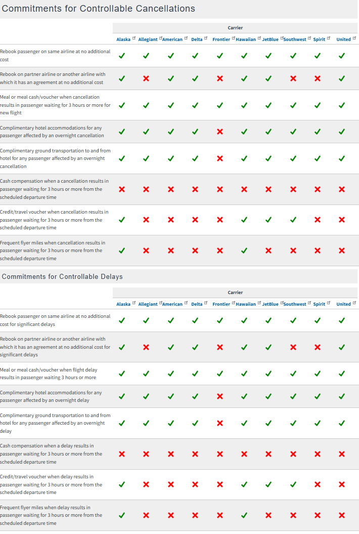 Airlines are now required to link to a DOT dashboard that shows passengers their rights when things go wrong. You can also find out which airline offers refunds, rebooking, meals, and hotel stays during delays or cancellations. You’ll typically see airlines display this link on their websites under the Customer Service Plans section.