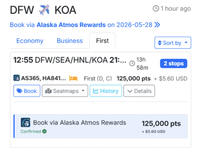 Points Required: 115,000 points on Alaska Airlines