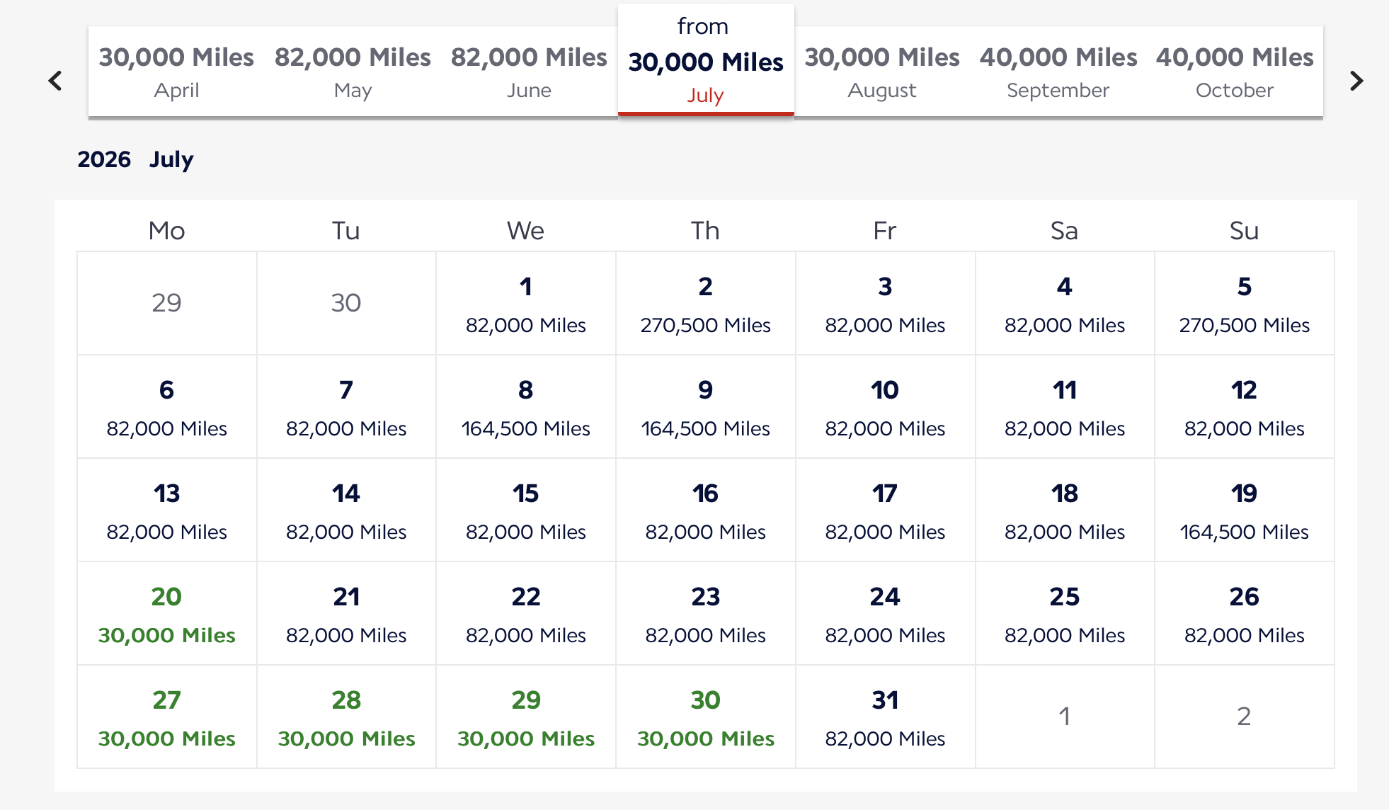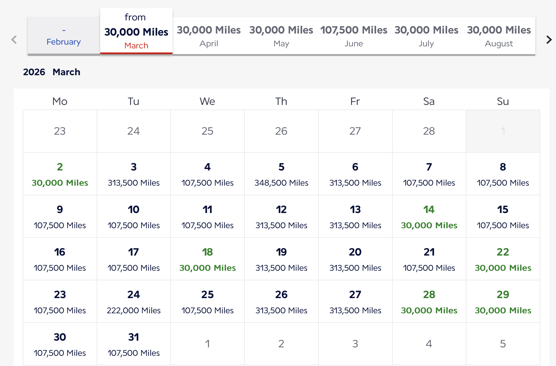 To book, log in to your Air France account and look at your preferred destination. Let’s take a look at a flight in premium economy from Chicago to Amsterdam. To display a 30-day calendar on the site, leave your dates blank during the search. There are many flights available for that 30,000-mile promo route.