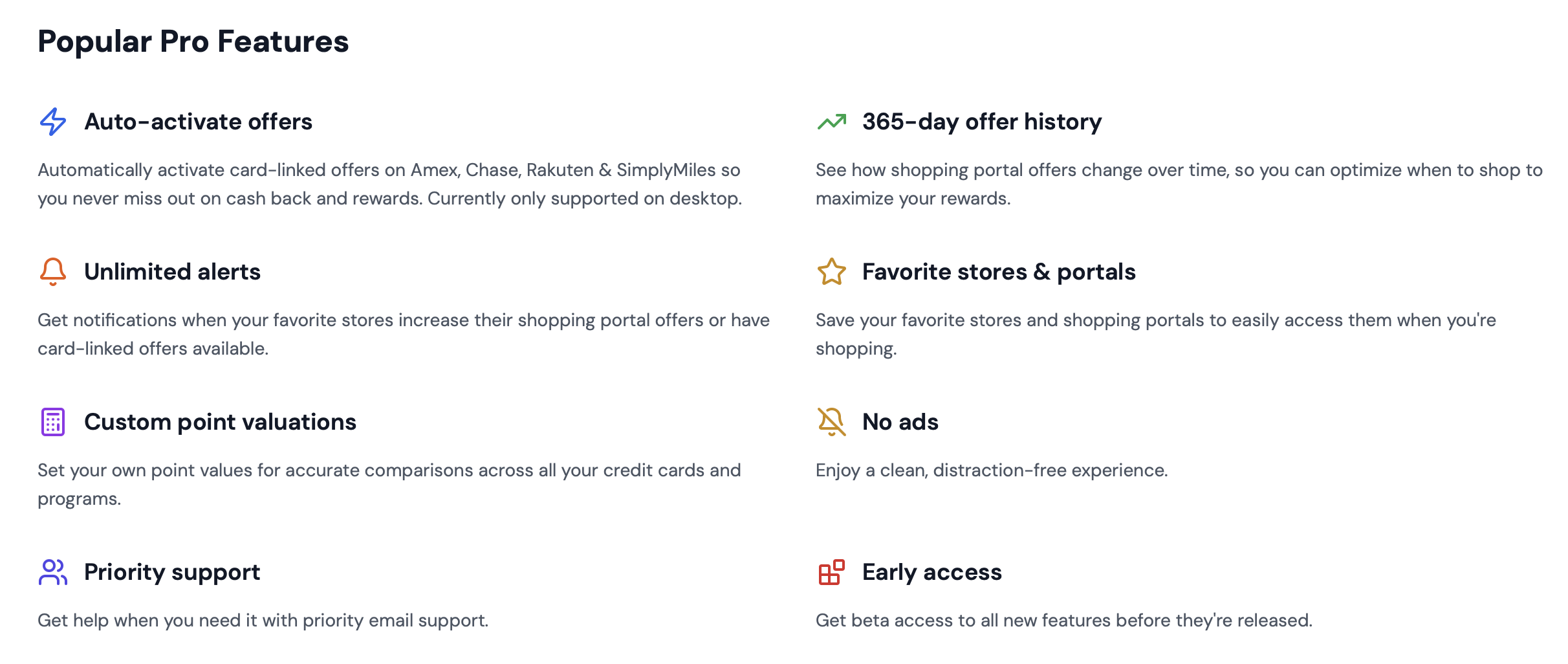 The Pro plan unlocks deeper features like auto-activation of Chase and Amex offers, a longer 365-day offer history, unlimited alerts, and the ability to customize how you value points and miles.