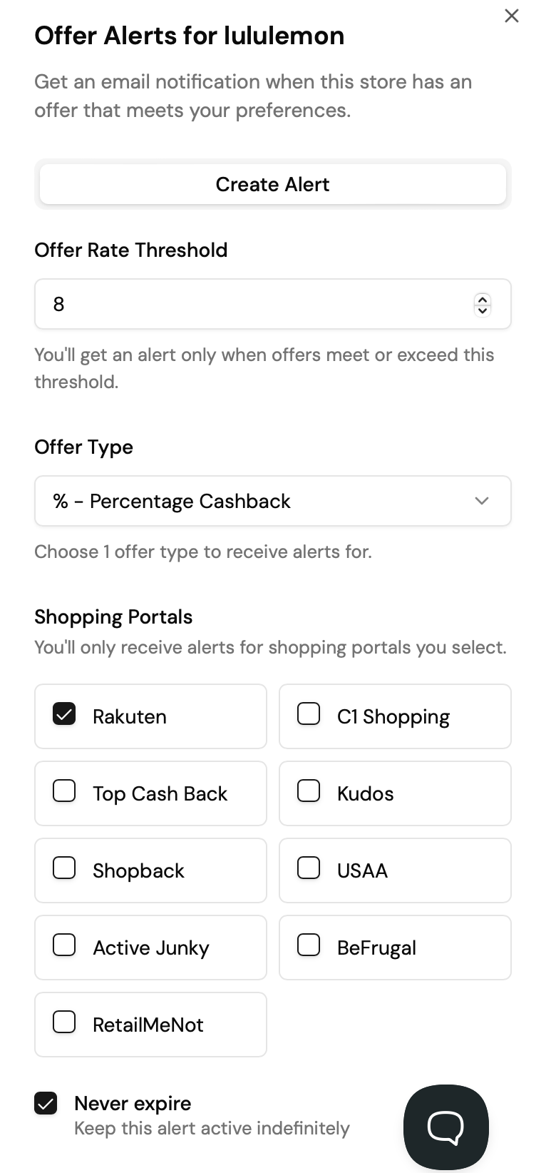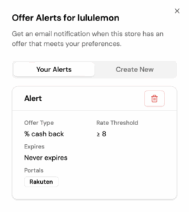 Alerts – Set up reminders for your favorite stores so you’ll be notified when a stores’s cash-back or points offer hits your desired level.