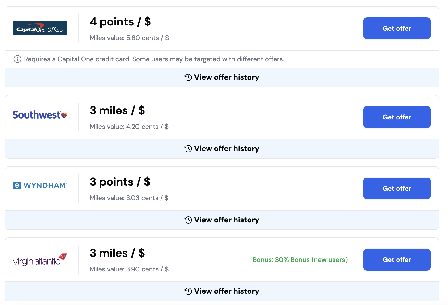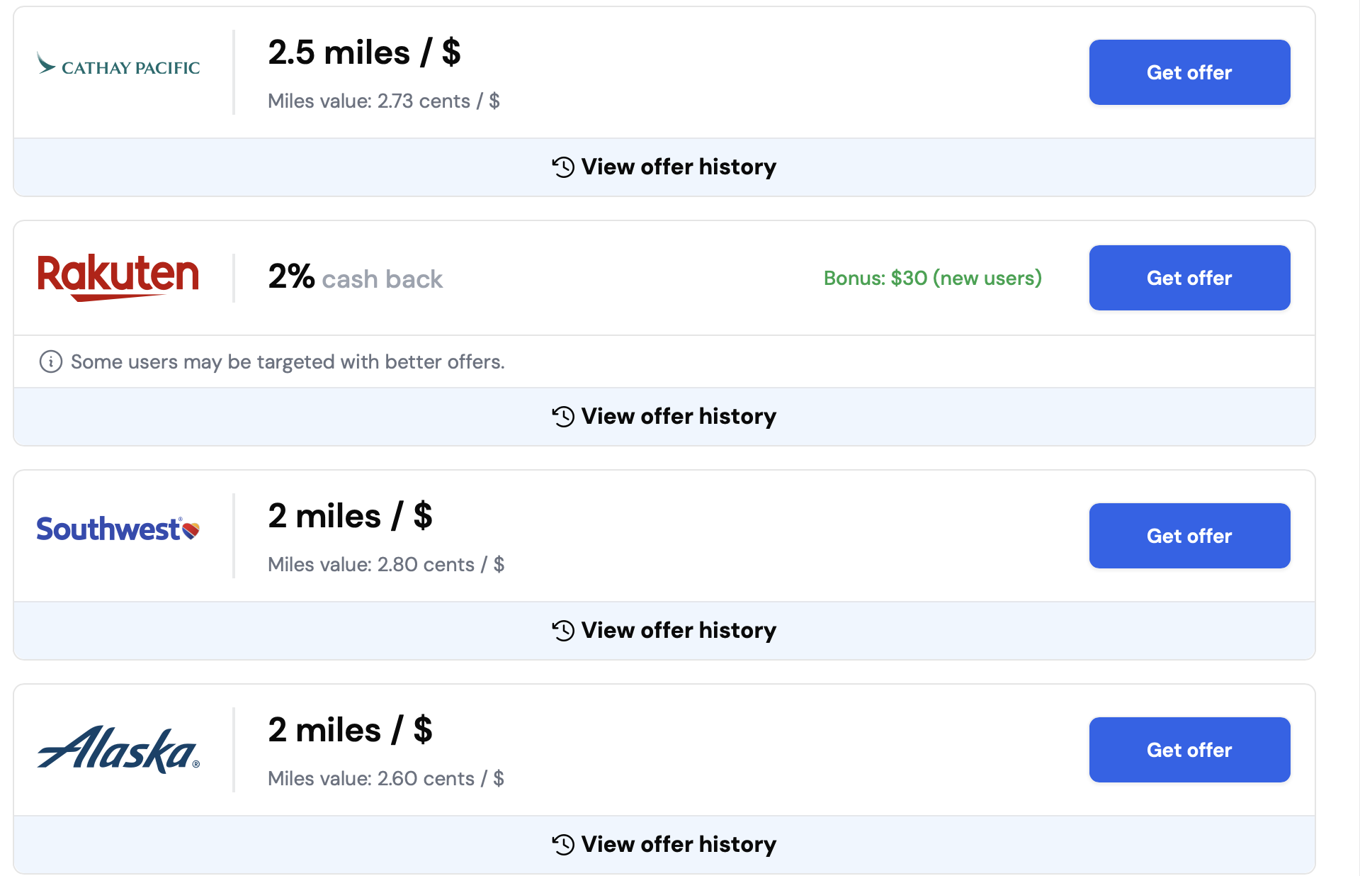 Offer History – See how cash-back or points rates have changed over the past weeks and months so you can time your purchases strategically. I love this to help me decide if this purchase is the best right now or whether I should hold off for a bit.