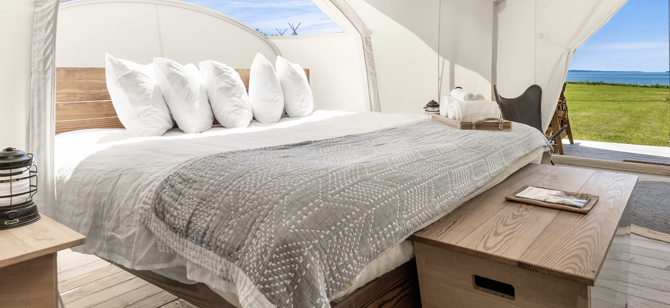 If you wanted to travel here with your partner, you could stay in the beautiful Stargazer Tent. This tent comes with a king-size bed, private bathroom, your own deck with outdoor lounge chairs, a wood-burning stove with firewood, and a night-sky viewing window above your bed.