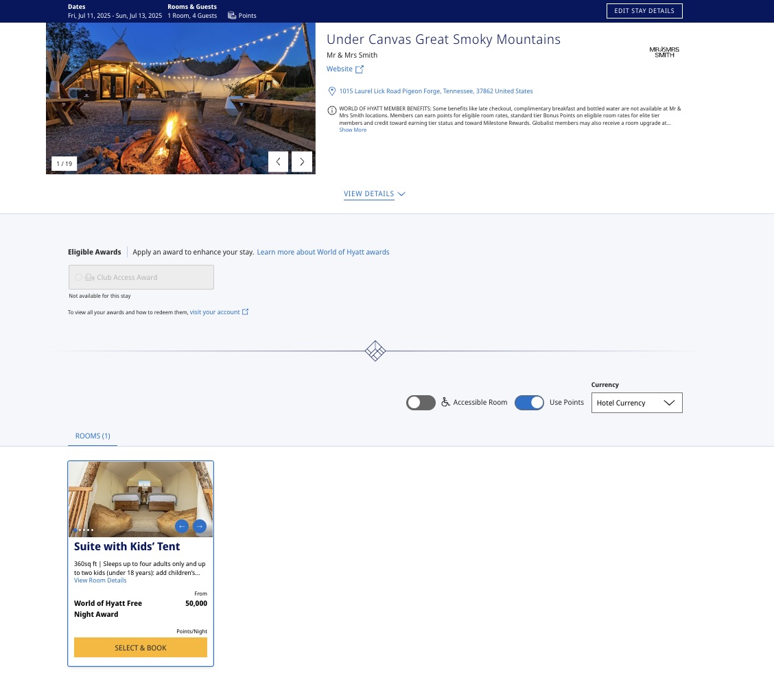 Under Canvas properties are bookable with Hyatt points thanks to Hyatt’s partnership with Mr and Mrs Smith Hotels, a group of more than 1,000 boutique hotels worldwide. Unfortunately, these properties do not fit into the World of Hyatt award chart that gives us such outsized value for our points. Instead, the points cost for stays is dynamic and related to the cash price. So many Mr and Mrs Smith hotels, including Under Canvas glamping sites, offer less than the two cents per point value we typically like to get by using Hyatt points.