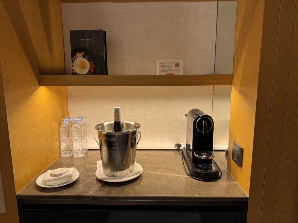 Our arrival day was super delayed, and we didn’t arrive at the hotel until almost 8 pm. I asked what time the restaurant served dinner, and the front desk attendant said that since we missed cocktail hour in the lounge, she would send a complimentary bottle of wine to our room. We must have looked desperate after a 24+ hour travel day from NY to South Korea with three kids in tow. 😅