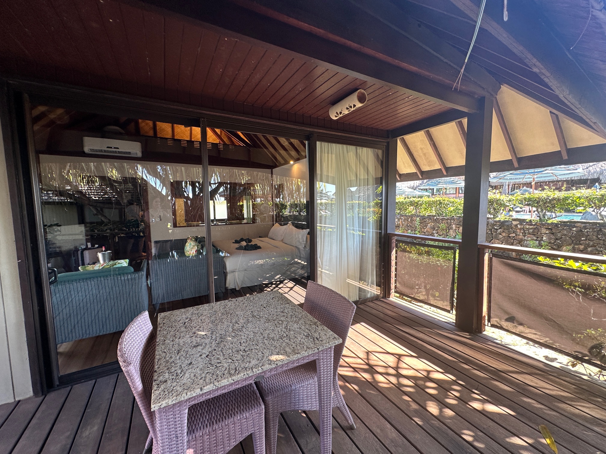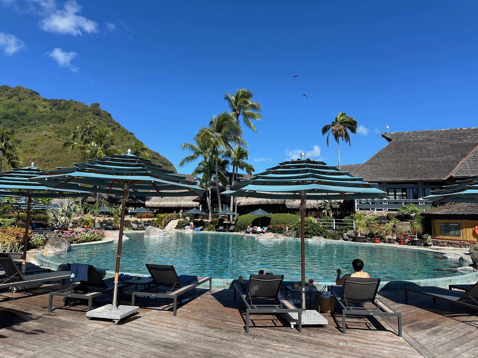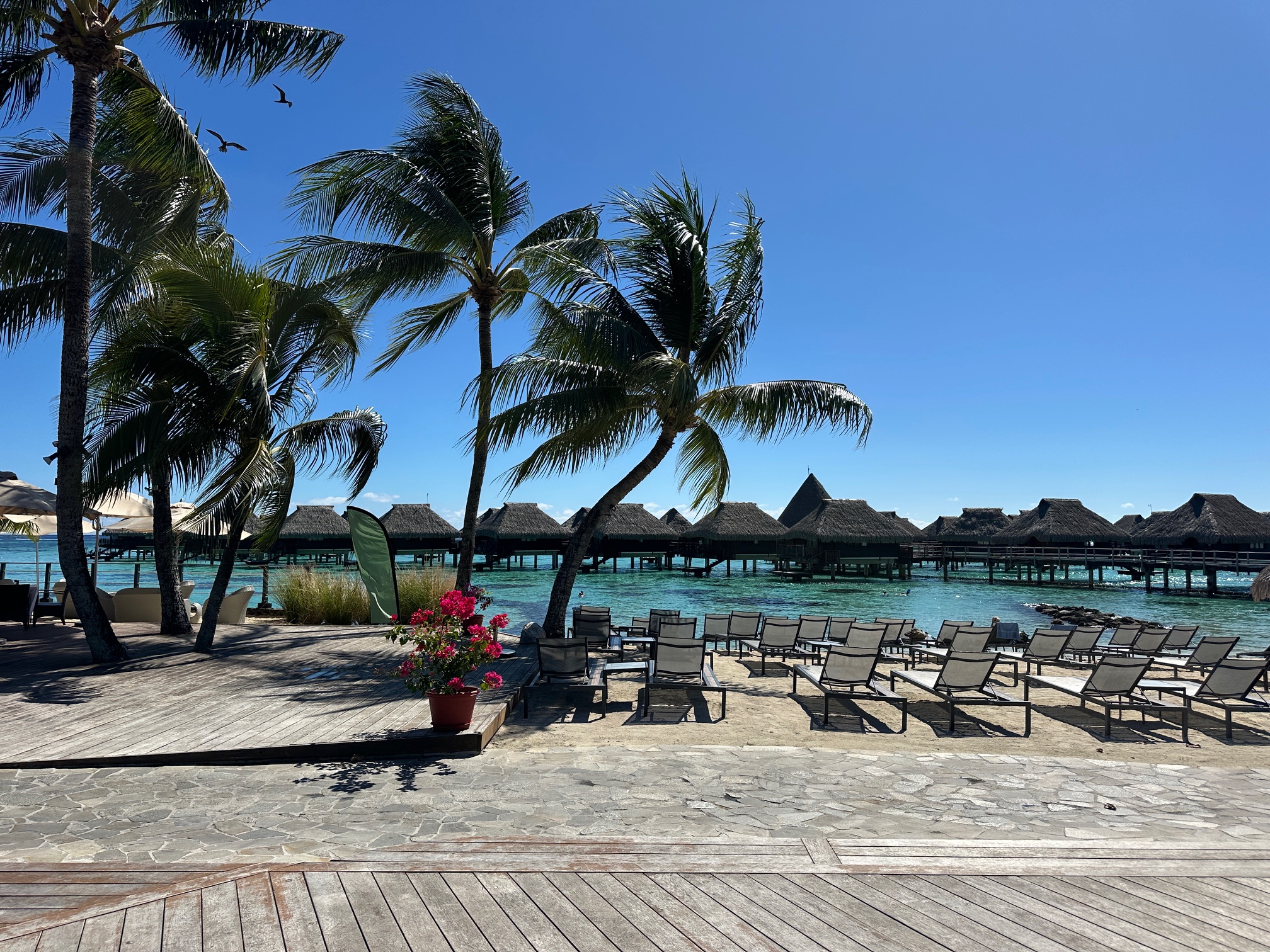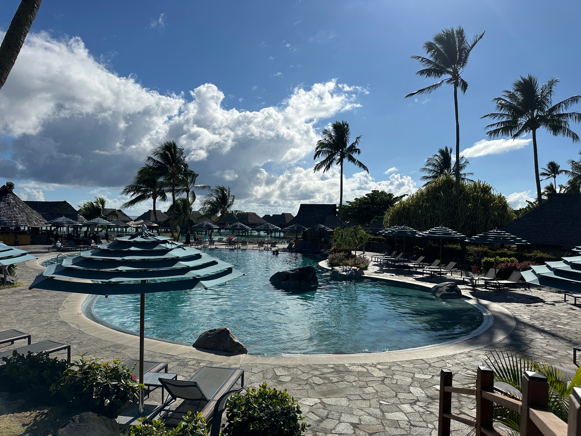 The resort stretches from the gardens down to a white-sand beach and a bright blue lagoon, where overwater bungalows sit above clear, shallow water. Garden bungalows are tucked into quiet spots with lots of plants around them. The whole place feels calm and relaxing, with the sound of the ocean. And the pool did not run out of seating, which is always a plus! It’s a quiet, tropical escape surrounded by nature.
