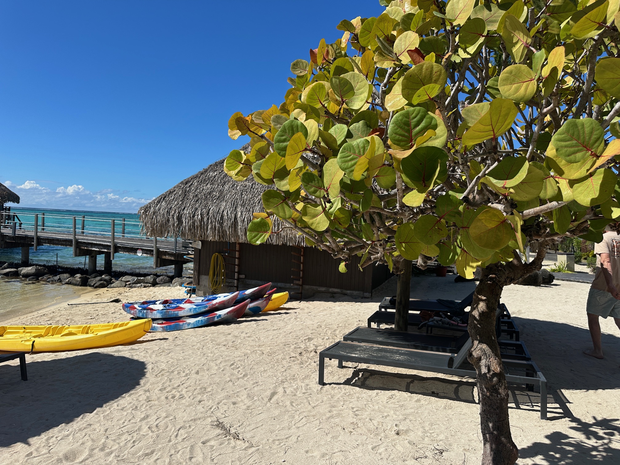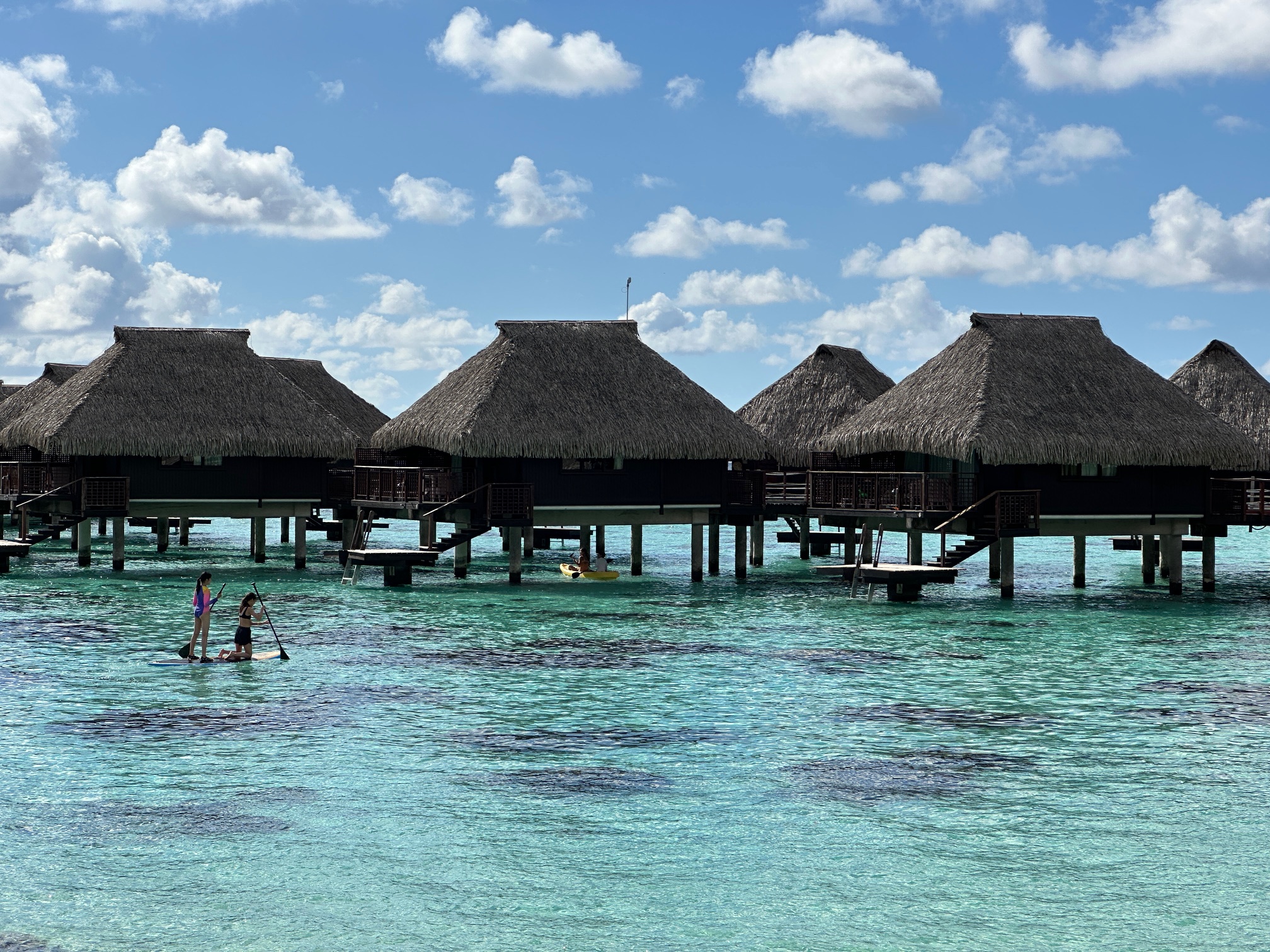 The use of snorkeling gear, kayaks, and standup paddle boards is complimentary. We enjoyed kayaking amidst all the overwater bungalows.
