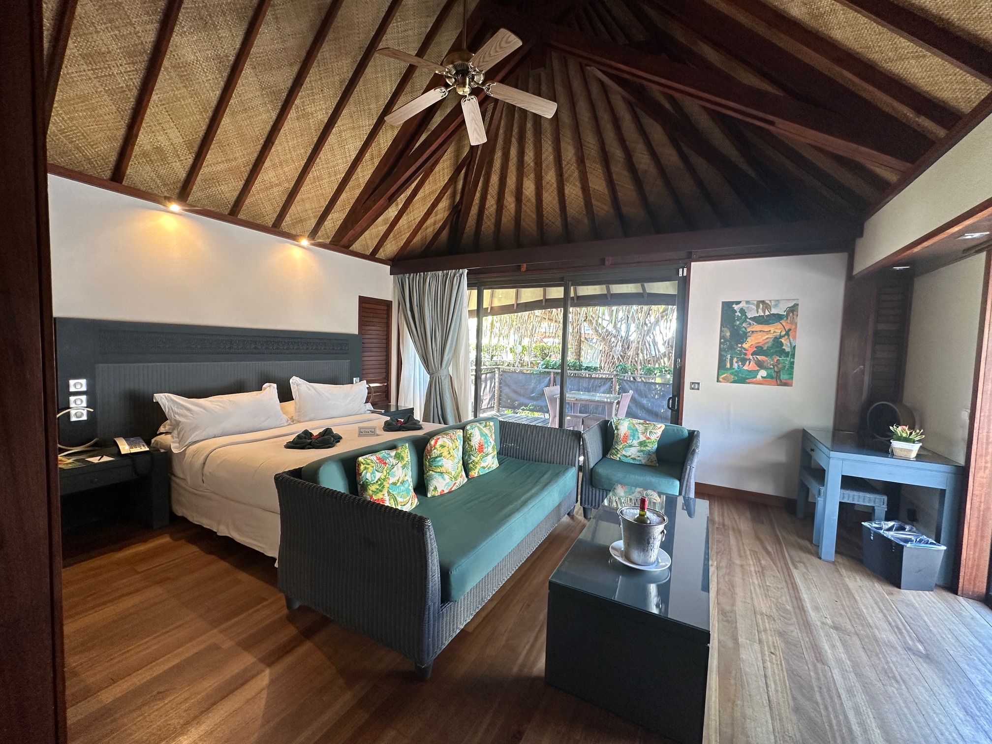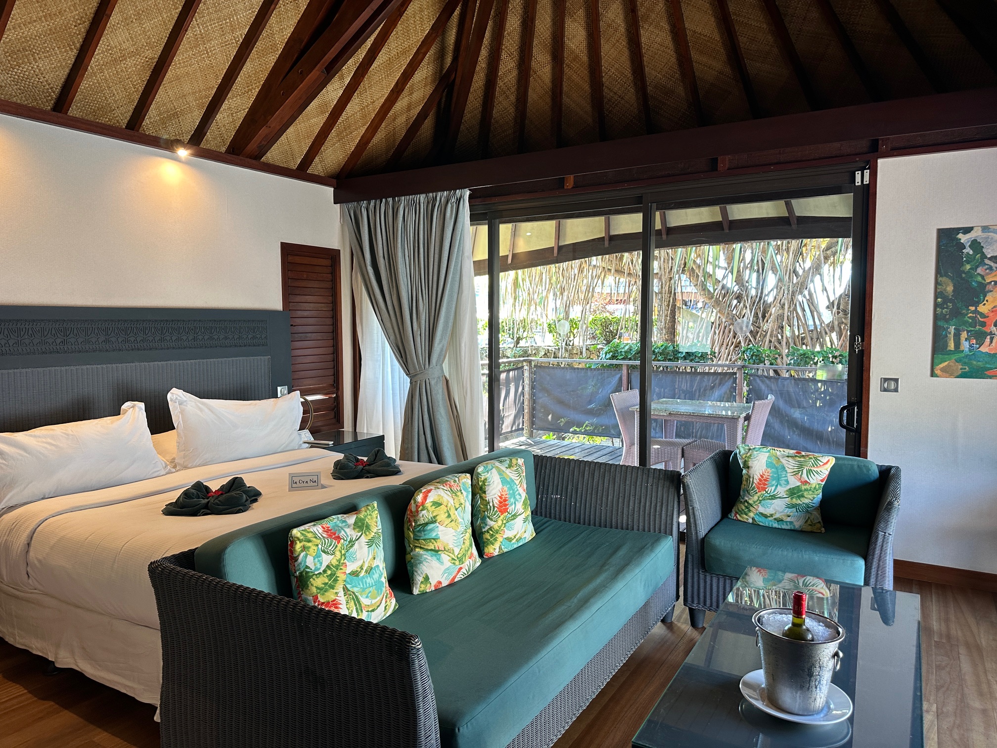 We met in Seattle and flew business class on Air Tahiti Nui, booked with 60K Alaska miles points. The flight took about nine hours and, while not the most luxurious flight, was comfortable with good service. It was definitely a good start to our trip. Unfortunately, we arrived in Papeete, Tahiti, at 3:30 am. 😩