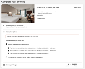 Once I was logged into my Marriott account and selected our dates, Marriott’s site applied my free-night awards automatically and included the top-off amount. You can see in the screenshot below that one night was 58,000 points, one night was 66,000 points, and one night was 50,000 points or less.