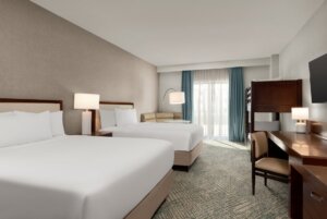 The Courtyard by Marriott Anaheim Theme Park Entrance is my absolute favorite hotel near Disneyland that you can book on points. It’s literally across the street from the Disneyland entrance, every room has a set of bunk beds (which means you can book a standard room with two queens and bunk beds and sleep an entire family of six), and it has an incredible 20,000-square-foot waterpark.