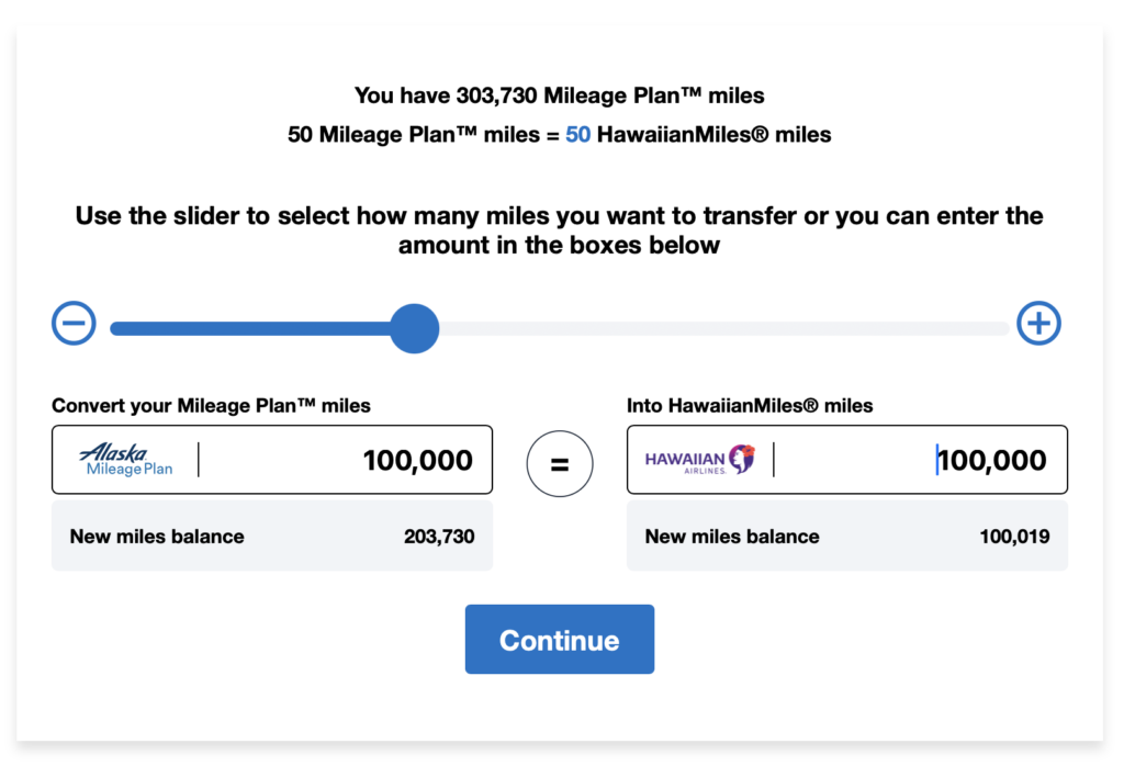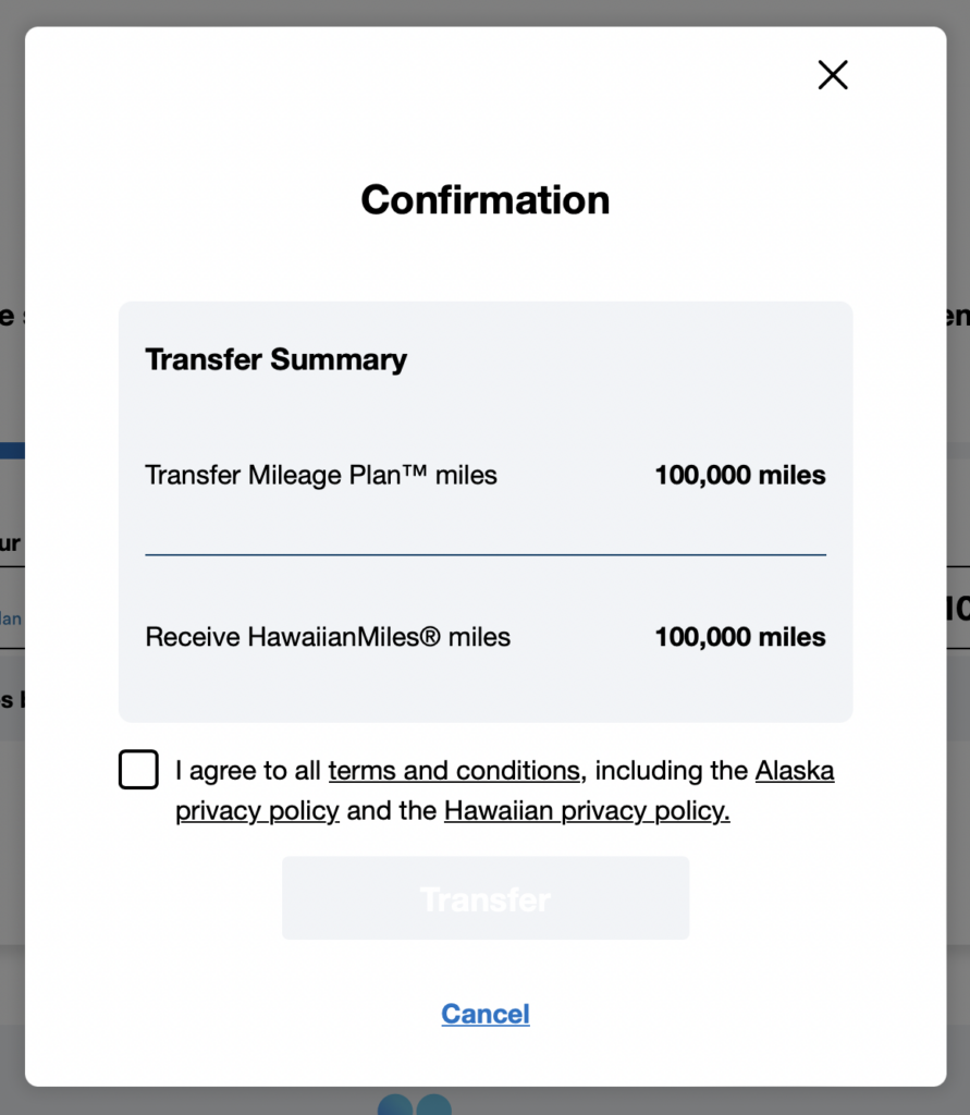 This is what you’ll see once you’re logged in to both airlines’ accounts. Here, I picked transferring 100K Alaska miles to Hawaiian: