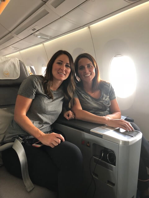 Enjoying business class-our best use of points on our Italy girl’s trip!