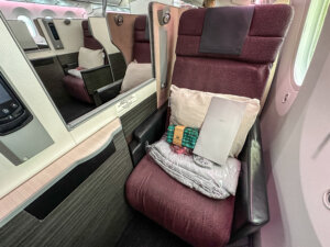 All seats in business class also recline into a lie-flat bed. There were headphones, slippers, a pillow, a blanket, and an amenity kit waiting at our seats. The amenity kit contained a toothbrush, toothpaste, tissues, a sleep mask, ear plugs, a phone holder, and a phone charger. (I loved this addition!)