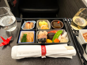 You will not go hungry on a Japan Airlines flight, that’s for sure! Most airlines allow you to pre-order your meals three to seven days before your flight if you’re a premium cabin passenger. A few days before our flight, I pre-ordered the Japanese meal for all three of us.