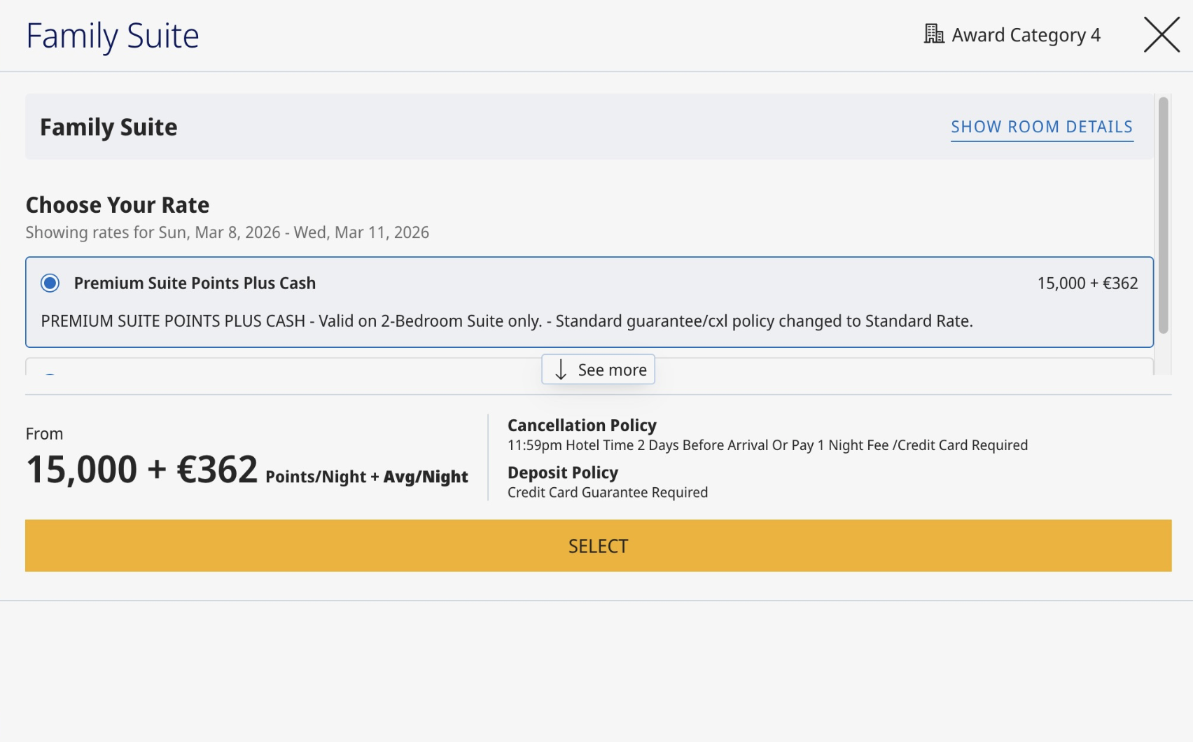 Like nearly all European hotels, I found standard rooms slept only two people. However, when I searched for two adults and two kids in March 2026, the hotel’s Family Suite was bookable for 15,000 points plus about $420 U.S. dollars. Given the relatively low points price of a room, two rooms would likely make more sense—unless you place a high priority on all being in the same room.
