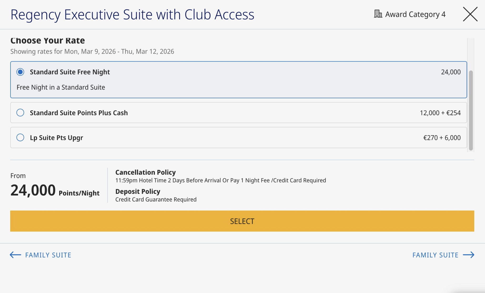 If you’re traveling with one child who doesn’t mind sleeping on a sofa, you can book the Regency Executive Suite with Club Access for 24,000 points per night (or a mix of points and cash). Just as with the other suite, you’d want to see what makes sense for your family and budget.