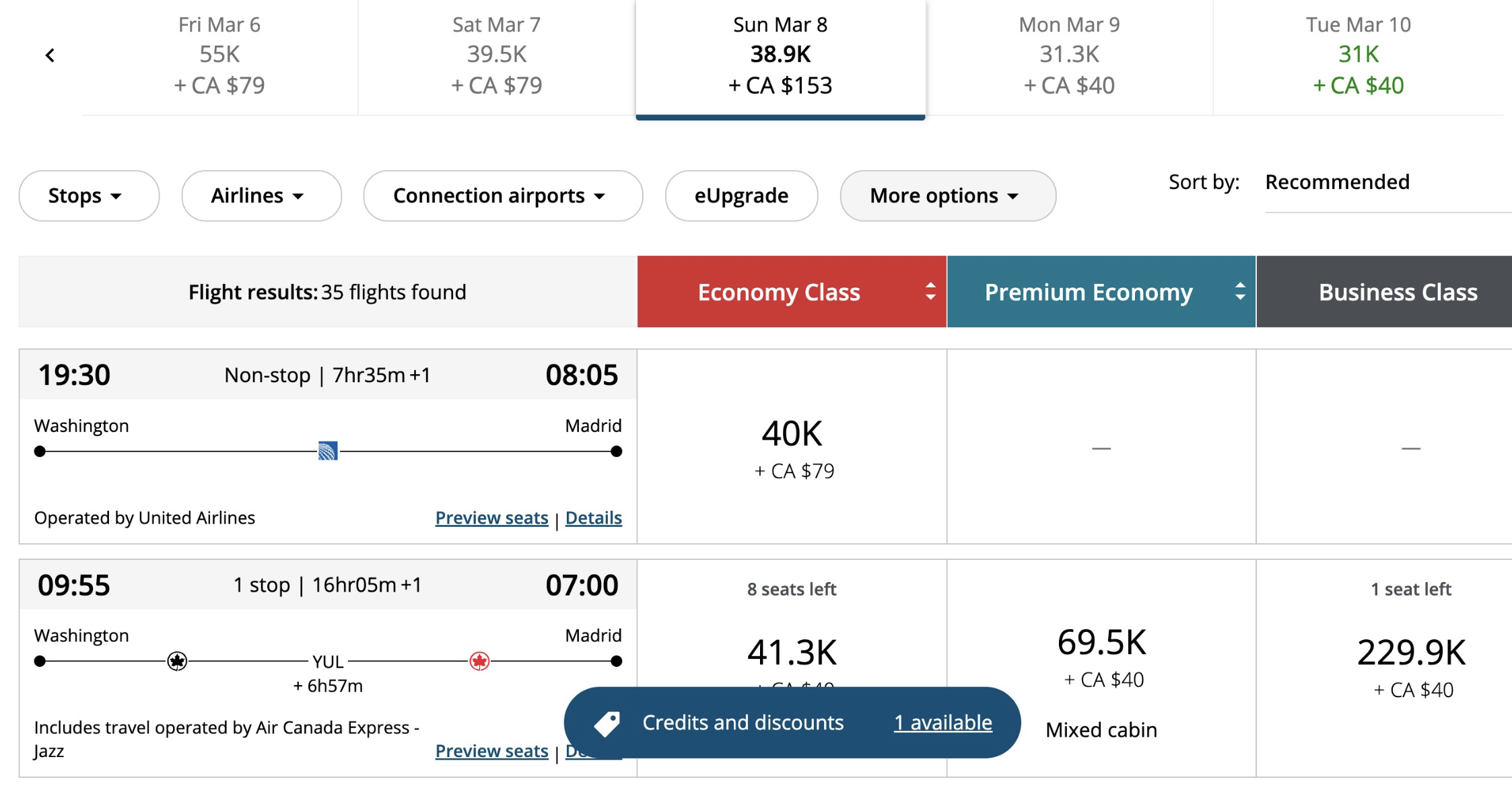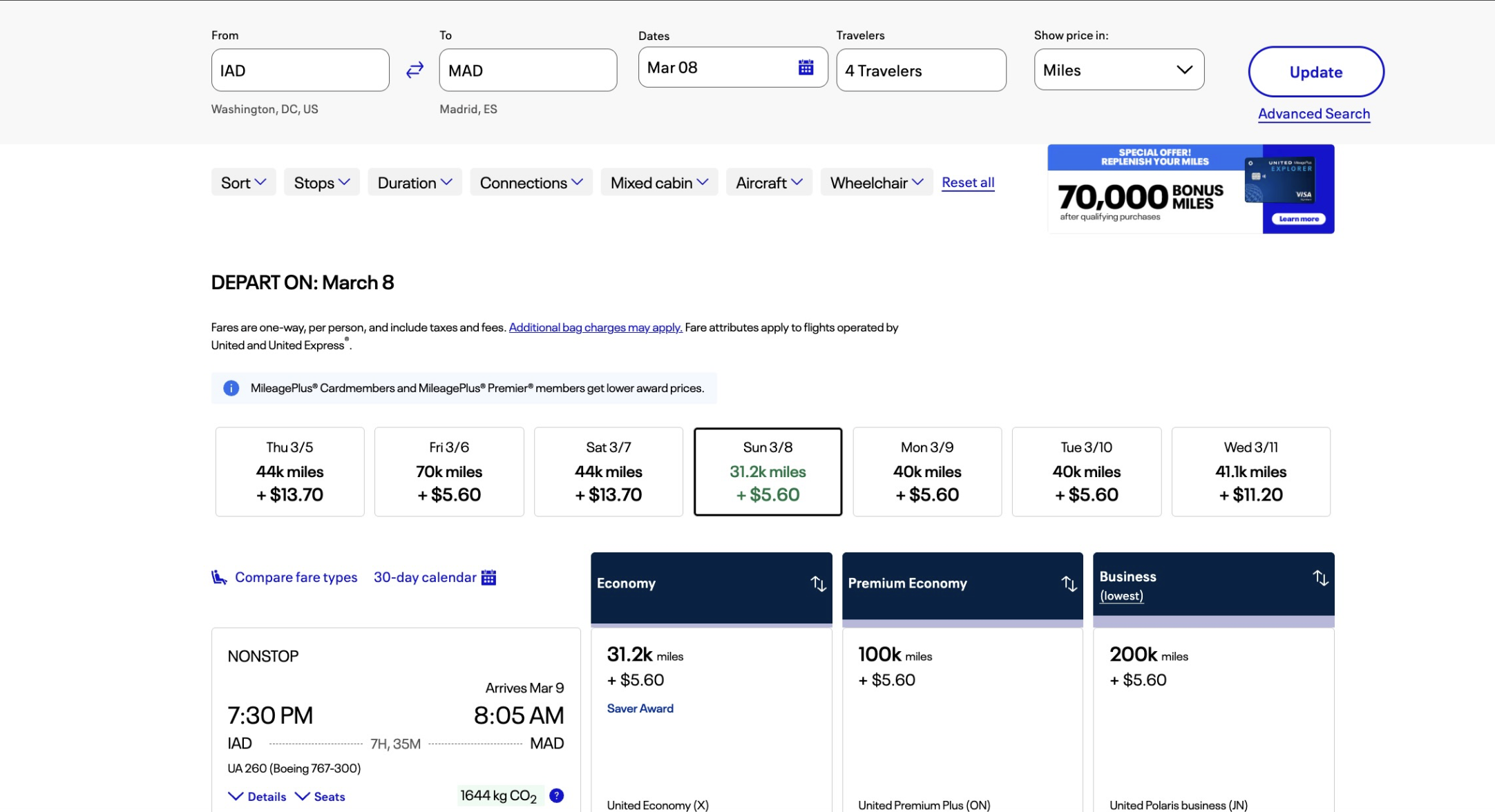 Let’s say we’re looking to go from Washington, D.C. (IAD) to Madrid on Sunday, March 8, 2026.