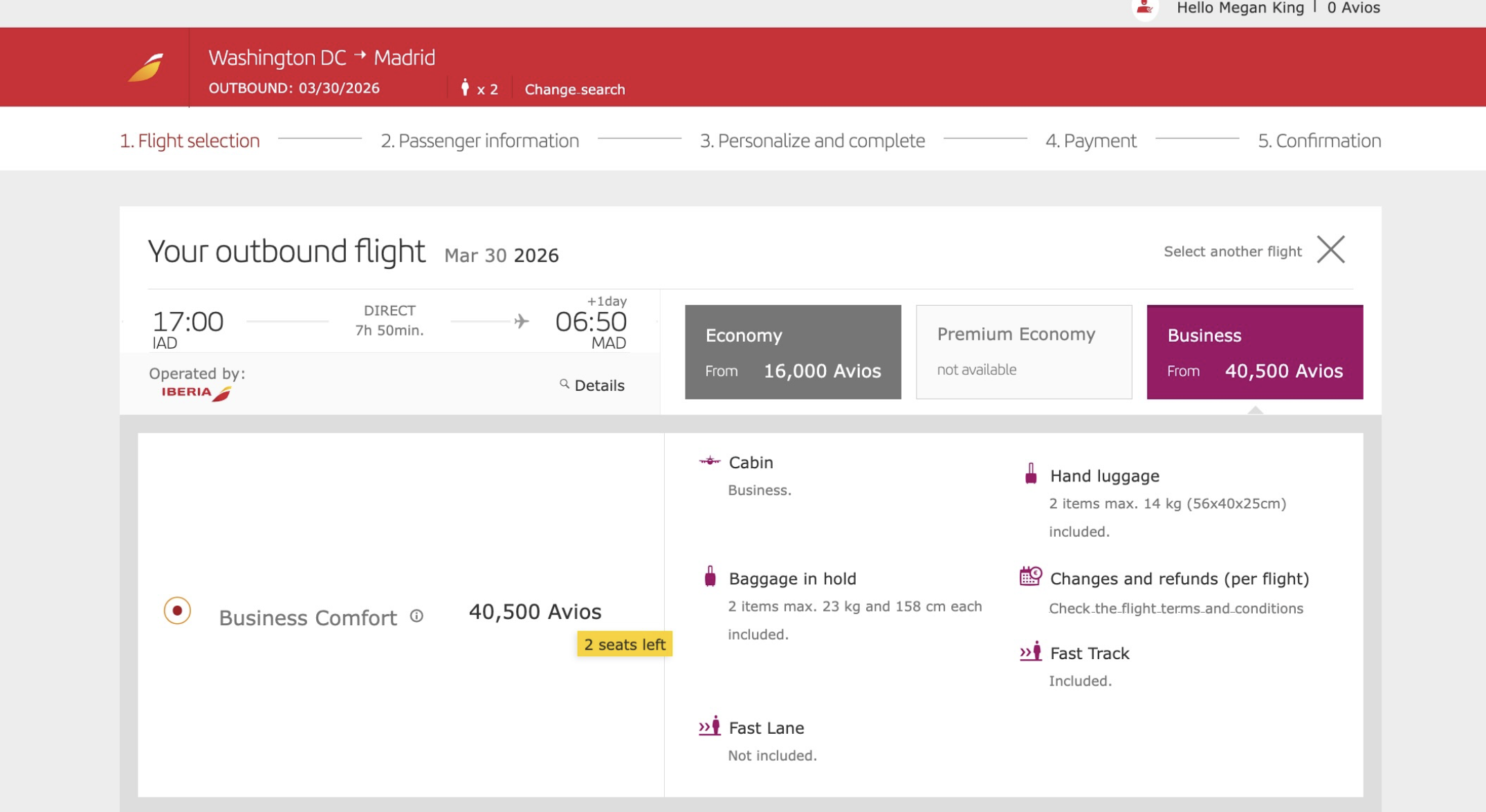 I searched other Avios airlines for this exact flight and didn’t find a better points price, so I would transfer points to Iberia and book directly. Even if I had found a less expensive option with another Avios program, I’d still want to book directly because of Iberia’s cancellation or change policy on partner bookings. You’d want to decide based on your risk tolerance and the likelihood you’d need to cancel or change your flight.