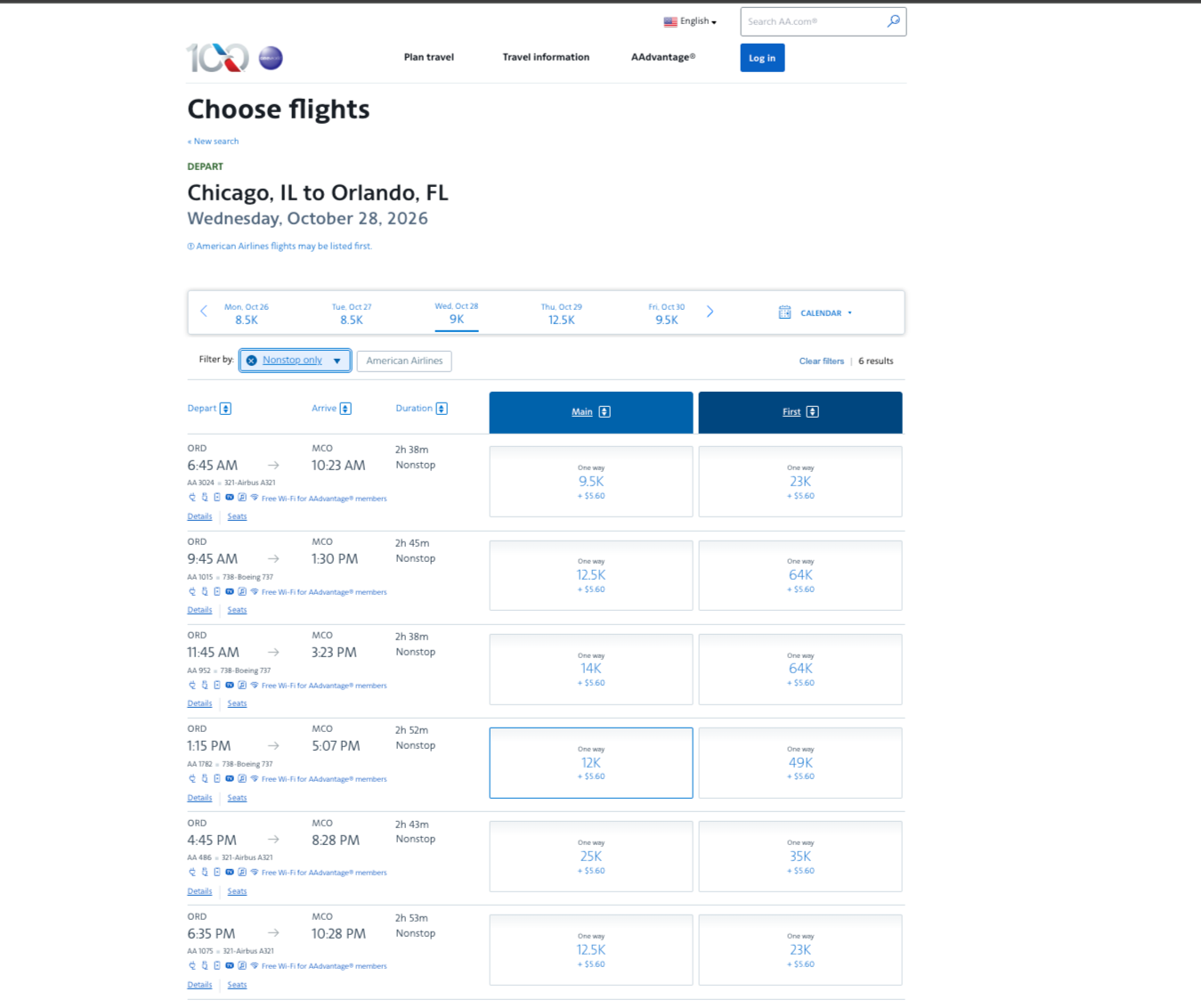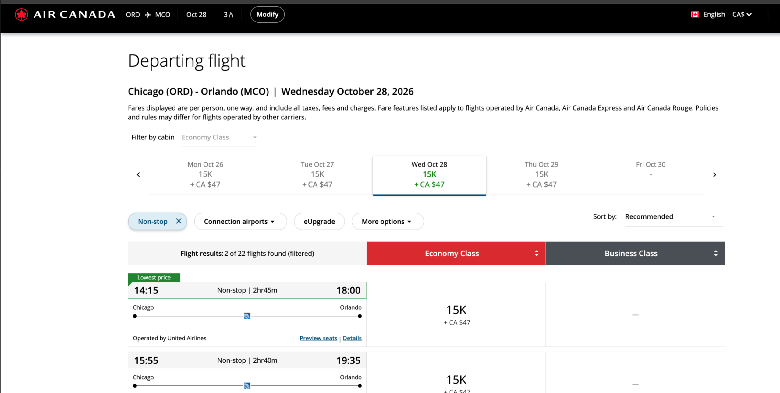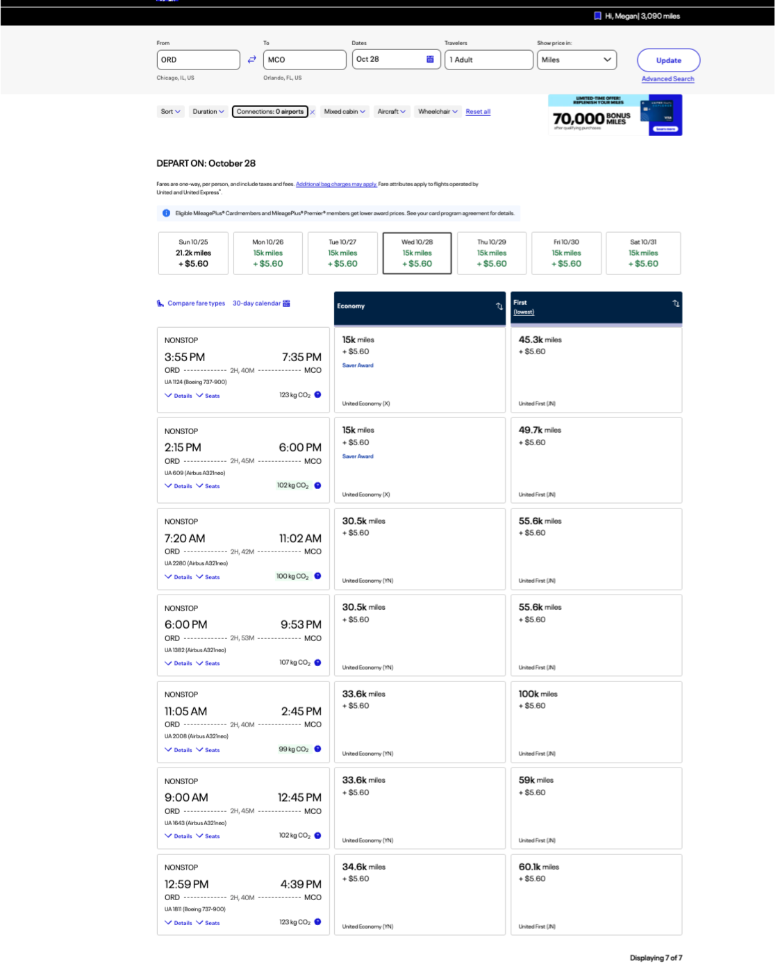 If you don’t have American miles or Atmos™ Rewards points, you can also book this flight via United for 15,000 miles per person plus taxes. Because Chicago is a United hub, there are lots of flight options to choose from.