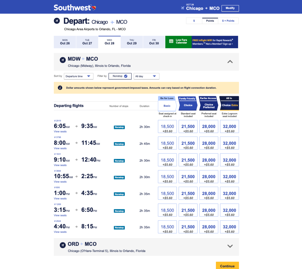 For this post, we’re going to look at booking a family of three from the Chicago area for a long weekend in Orlando around Halloween. Luckily, Chicago has lots of direct flight options, so this family trip should be relatively easy to book with different types of points.