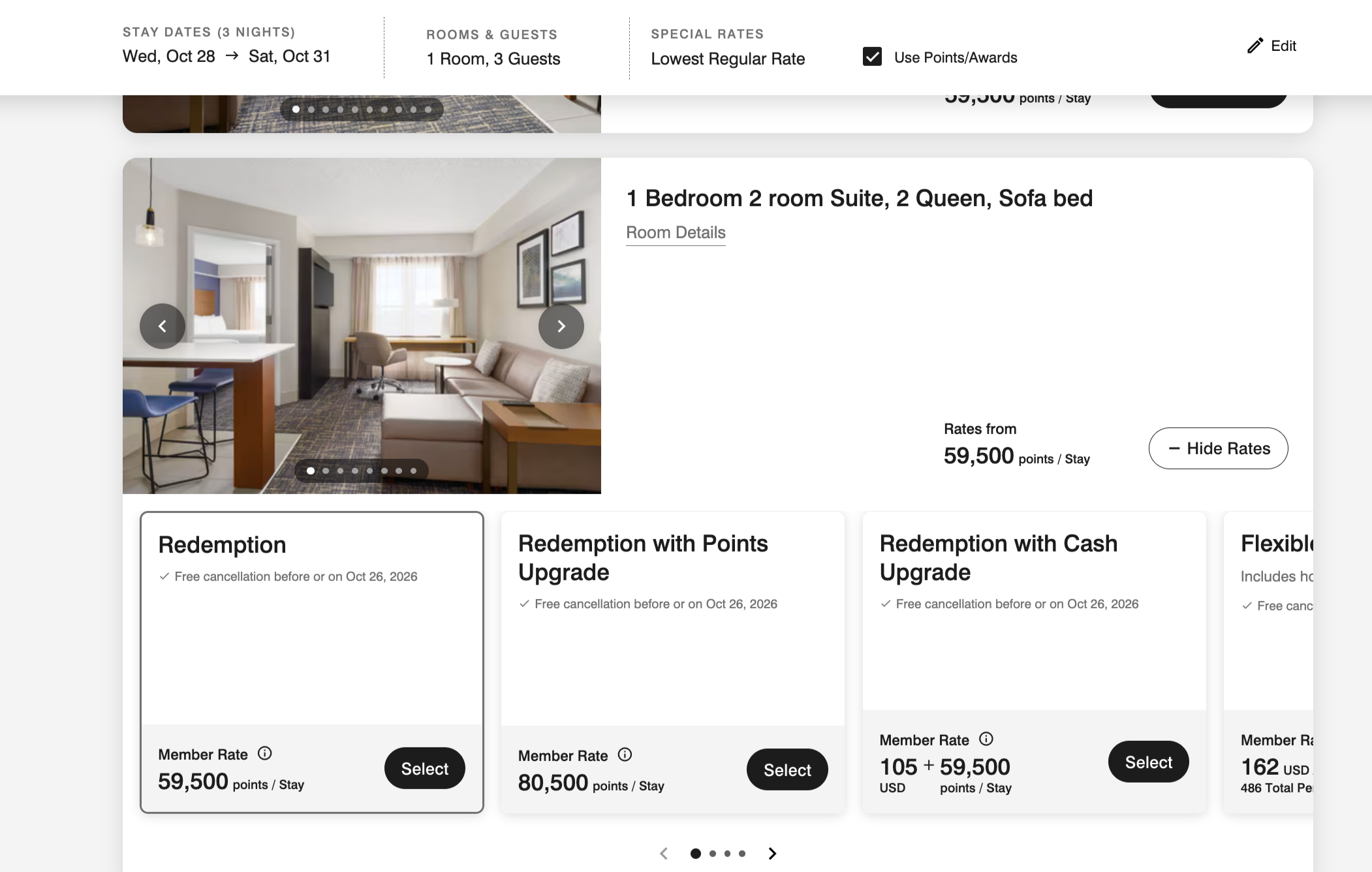 I found rooms at this property between 90,000 and 105,000 Hilton points per night for various dates in October. Around the same time, rates were more than $500, so this example would also be a great use of the ultra-valuable Hilton free-night certificate!