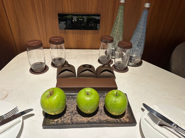 When we got to our rooms, we found a variety of treats waiting for us: fresh apples, assorted candies, date treats, and bottles of water. Shortly thereafter, the staff brought us fresh-squeezed orange juice, and cookies awaited us each night after turndown service. Additionally, there was a small complimentary minibar and snacks.