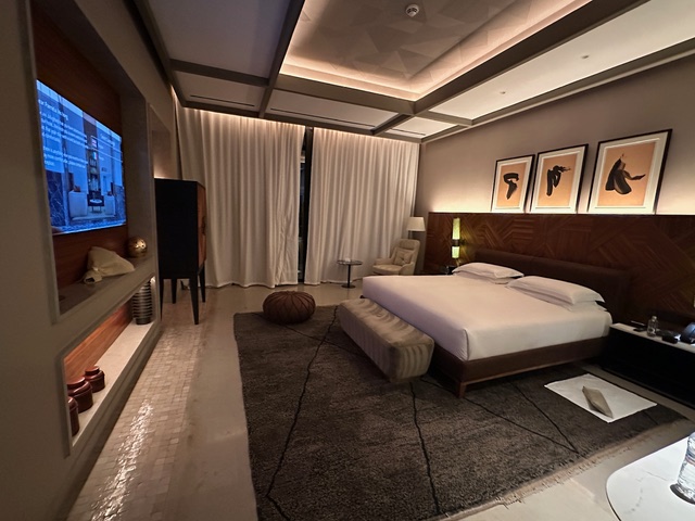 The Park Hyatt Marrakech is a Category 7, and we stayed on off-peak nights, so we paid 25K points per room per night. Occupancy is only two per room, so we got three rooms, and I got to hang out by myself in this gorgeous room for two nights. We used three suite upgrade awards for suites that would have cost $600 per night otherwise.