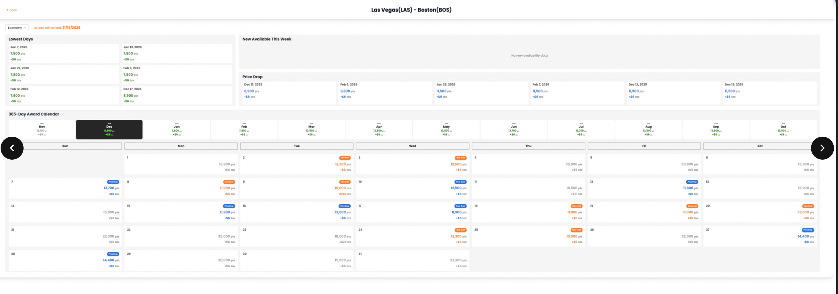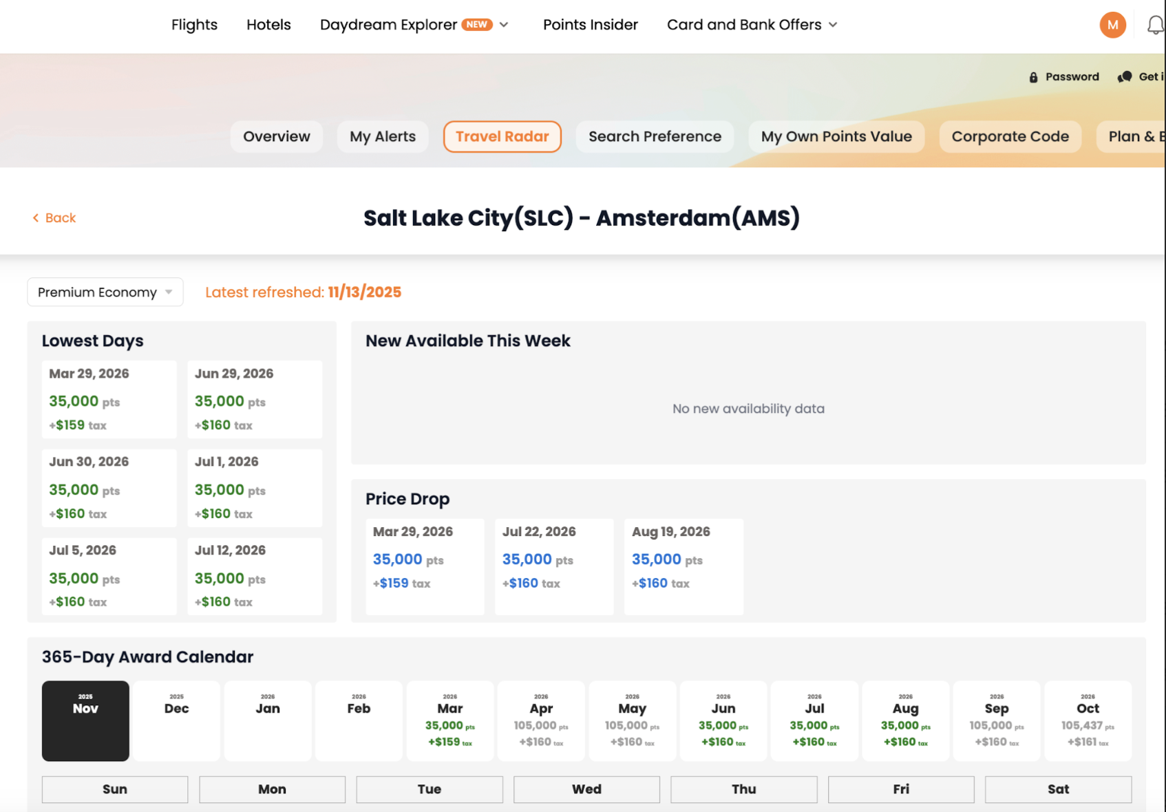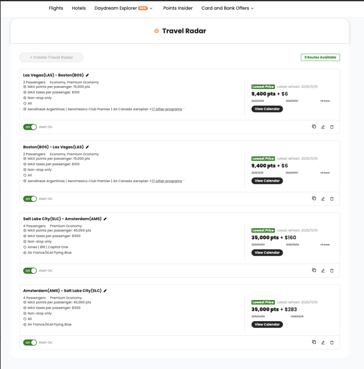 Launched in September 2025, Travel Radar is a feature within PointsYeah (for paid subscribers) that allows you to set up a personalized, year-long award calendar for the routes you want to travel. You can set these calendars up for up to four routes at a time. The calendar shows an at-a-glance view of the points price on the route you want to fly, in the cabin you’re looking for, with the points you have. The routes can update your radar if points prices drop.