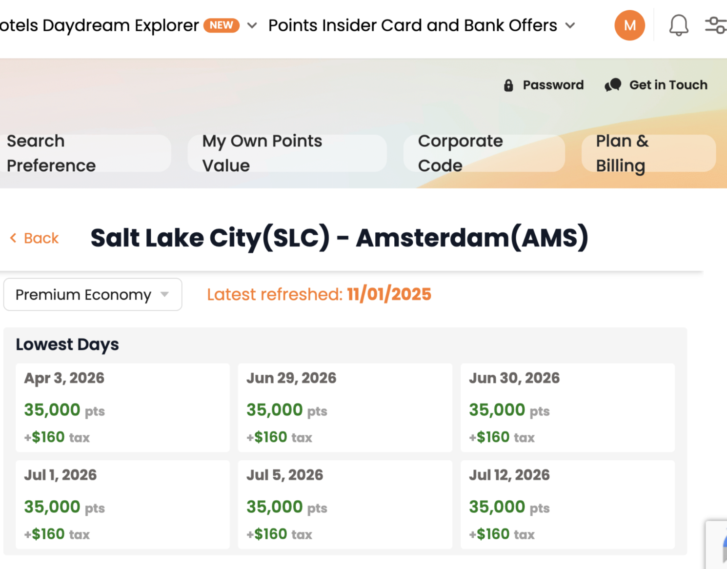 About six hours later, I had the first results. There were a few dates (interestingly right around spring break time) that had the less expensive price of 40,000 points per person plus $160 in taxes. By the time I got back to PointsYeah Saturday evening and did a real-time search, some of those dates were gone, and others (in that same April 2026 timeframe) had become available. That shows the importance of always running a real-time search and validating availability on an airline’s website before transferring points.