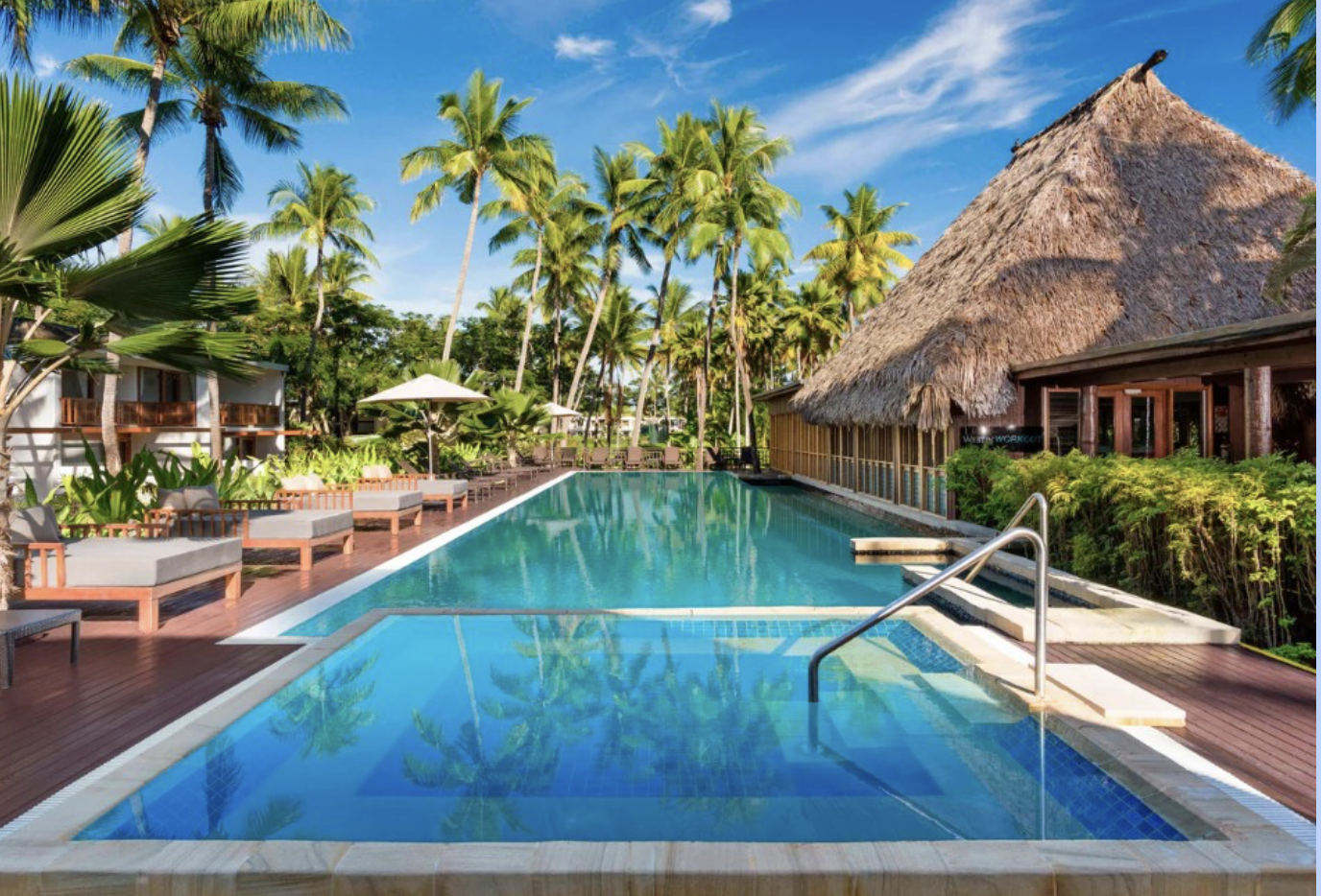 Just twenty-five minutes from the airport, the Westin Fiji Golf Resort & Spa makes arrival day feel effortless. Spacious rooms offering two doubles or a king plus connecting rooms mean no one is stuck on a cot. Tropical gardens and ocean views set the scene, but the real family gold is the LaiLai Kids’ Club at the neighboring Sheraton.