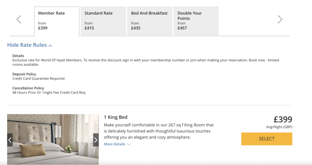 The price of this hotel was over 400 pounds so almost $500 and cost me 25K Hyatt points stay there. I really like using my Ultimate Rewards to transfer to Hyatt stays as I can always get outsized value with them. To stay at a Marriott of similar quality would require upwards of 70K Marriott points.