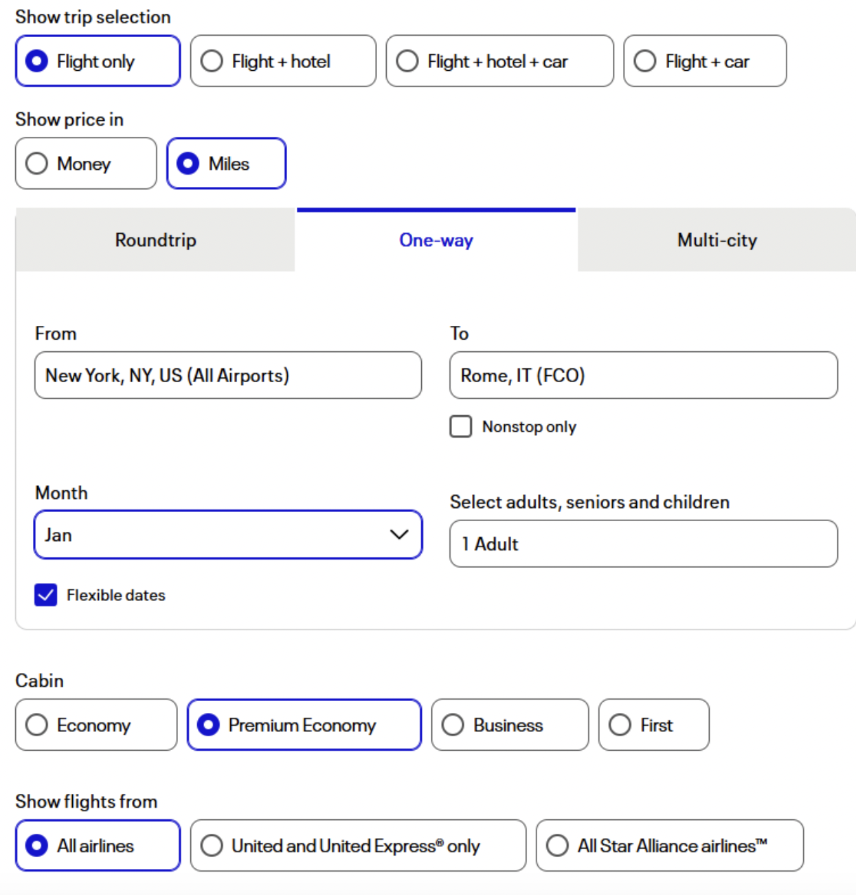 Getting There: Positioning to the East Coast will get you some great points redemptions to Rome via New York, Boston, or Washington D.C. However, these same deals can be found from San Francisco, Los Angeles, and Chicago. Use United’s advanced search option to review award flights in premium economy with flexible dates that will span an entire month to find the best deals.