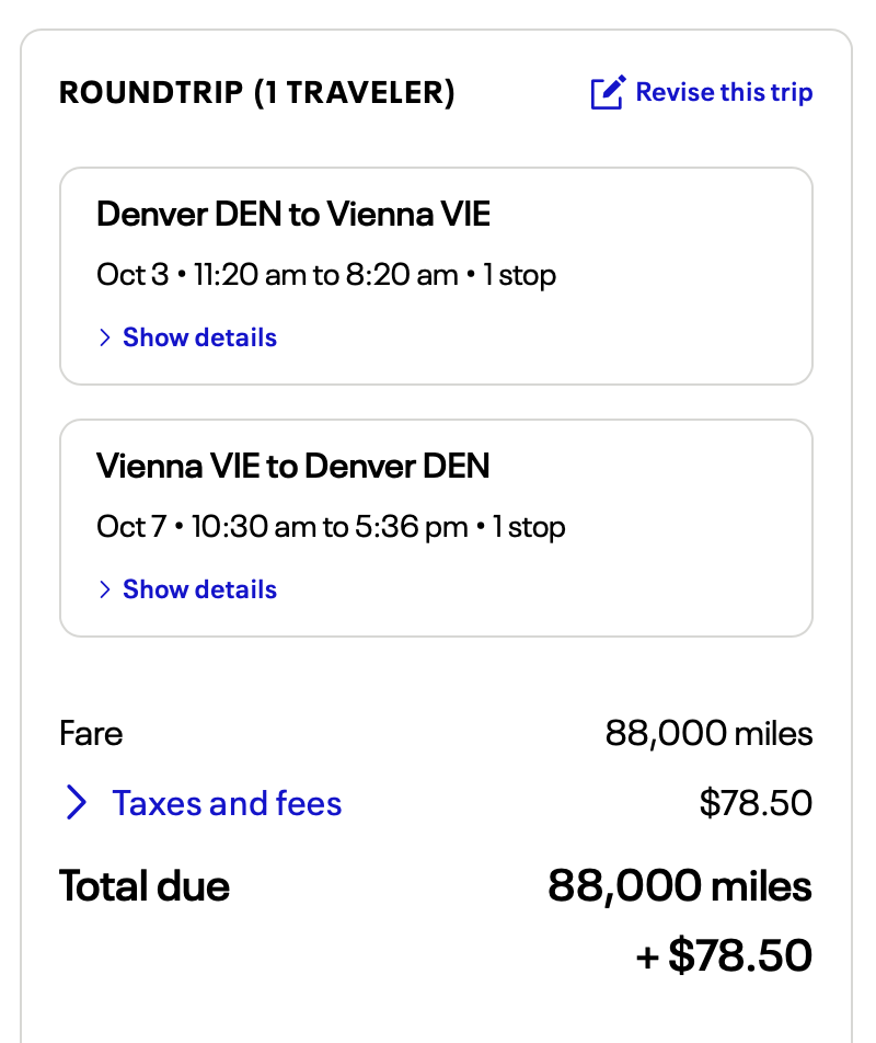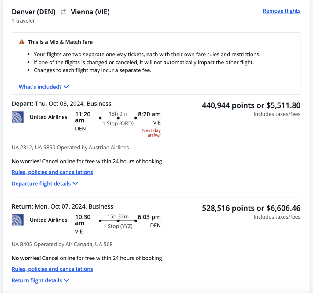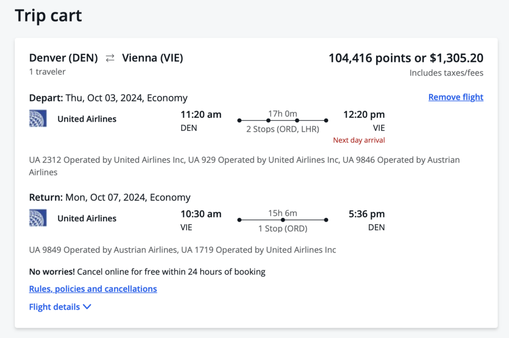 Next, let’s check a more expensive flight. I want to book a flight to Vienna, Austria. We’ll see what we get from the same dates, leaving from Denver.