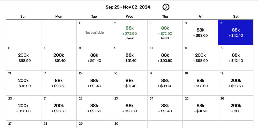 Let’s check out the United site using Ultimate Rewards. Flexibility is key in award travel, especially business travel. I like to look at the 30-day calendars and let the award prices dictate when I travel. By picking the 88K dates, I can travel for 176K roundtrip in business class. I ALWAYS do transfer partner bookings for my business class flights.