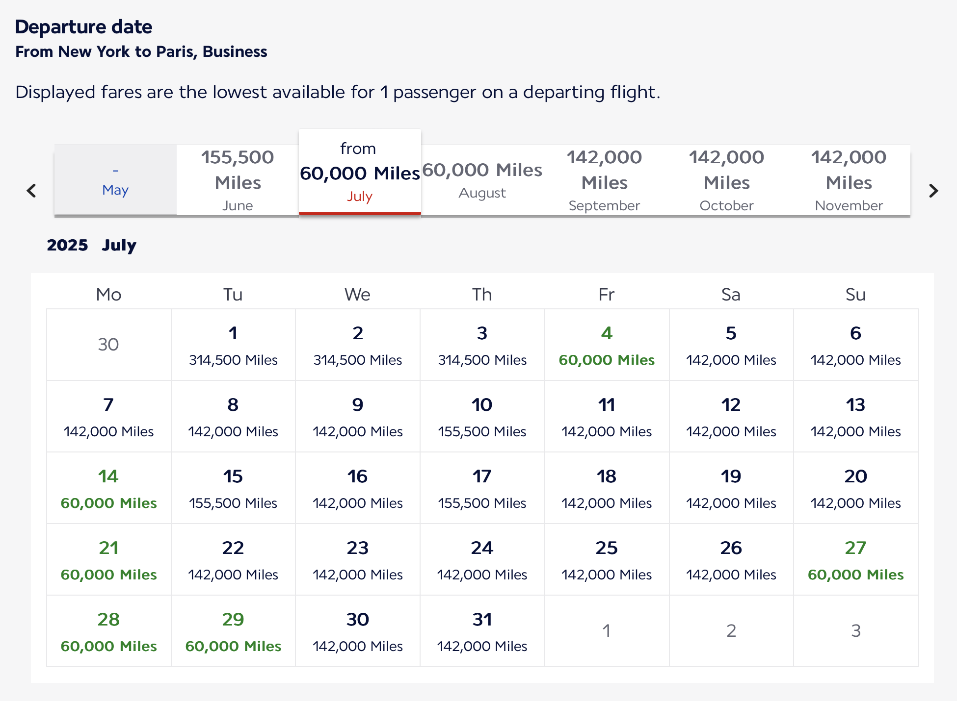 When I click search flights, I can look at monthly calendar to find 60K business class flights. The current month shows first but you can click through other months easily.