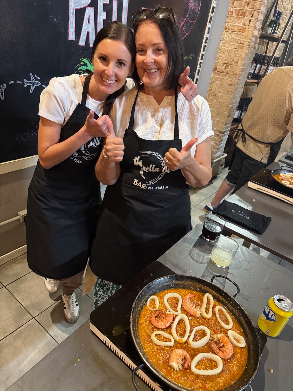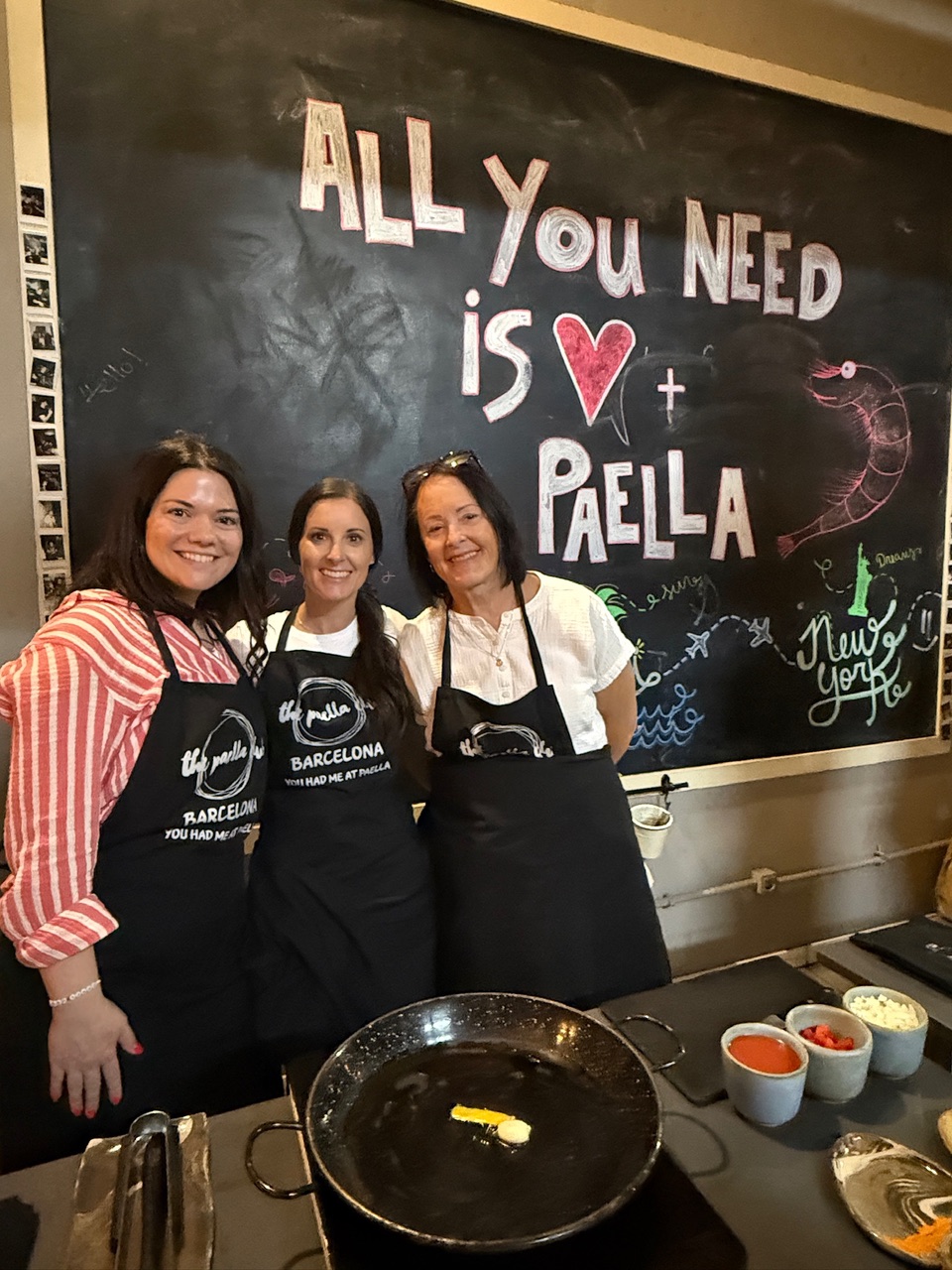 Later that day, we did a paella cooking class, which was, hands down, the most fun and delicious experience we had in Spain! Turns out the host is a stand-up comedian, and he is hilarious. We highly recommend The Paella Club—you will seriously thank us for a good time. The cost is approximately $80 per person, which includes wine or soda, appetizers, our paella experience, and dessert. We laughed, danced, cooked, and made friends with people from around the world. There is space for about 16 people in each class, which lasts about 2 hours.