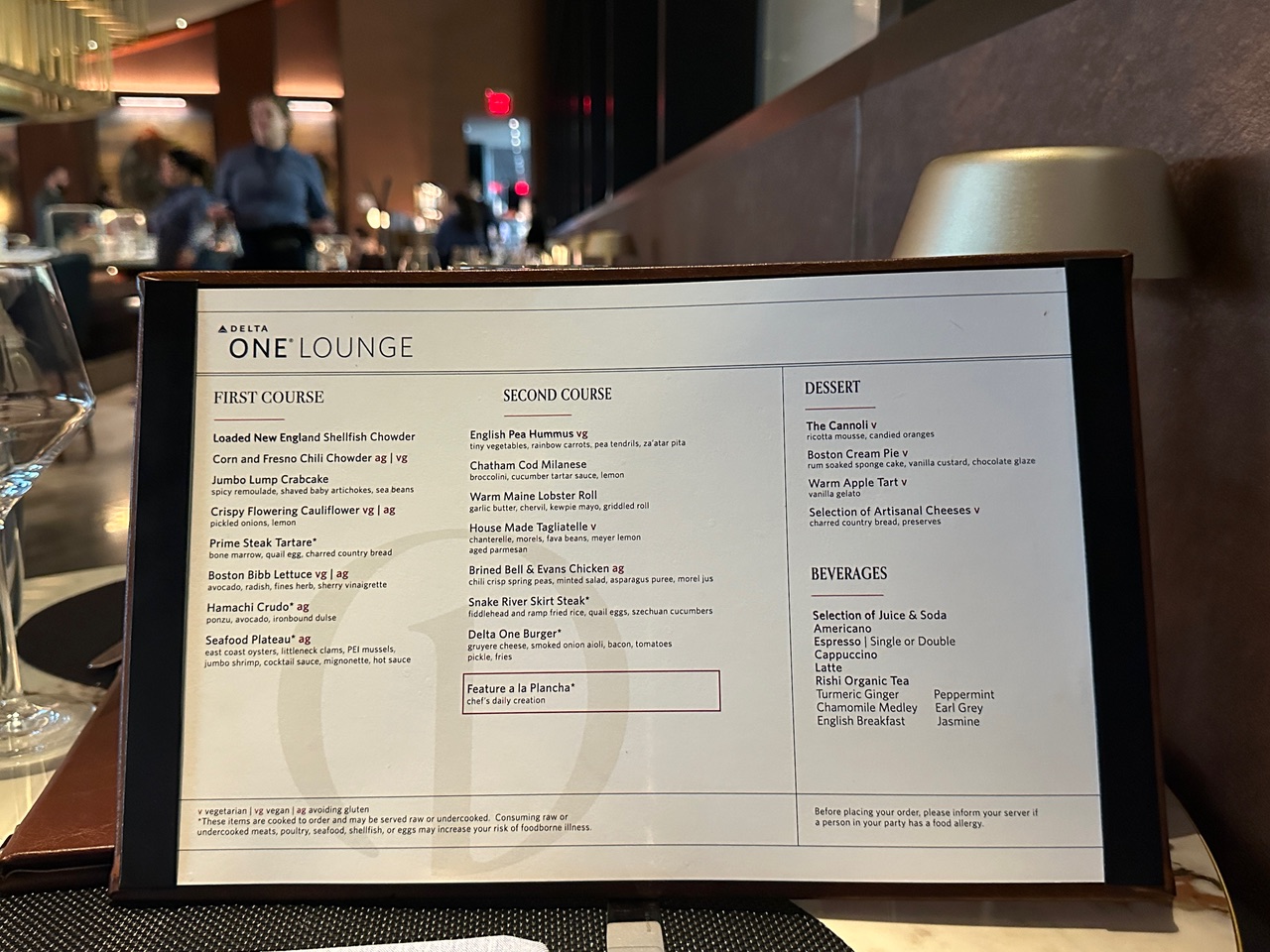 In Boston, I went to my favorite Delta Sky Club. It was made even better because my Virgin Atlantic business-class flight allowed me to visit the newly opened Capital One Café, and this meant ordering from the menu. I had a delicious corn chowder, a chicken and asparagus dish, and then finished my meal off with a sublime apple tart! It was so good that I just had dessert when I got on my Virgin Atlantic flight and then went to sleep!