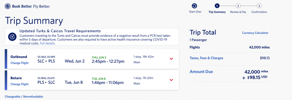 This example shows that the first flight is long, necessitating a stopover in another city. This is how my first flight to Turks went on United.