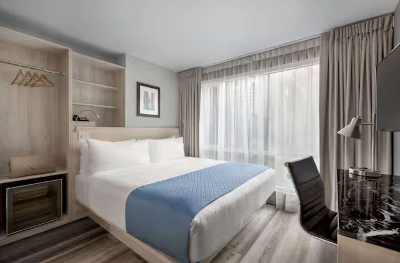 This boutique-style hotel offers European-inspired elegance in the heart of the Theater District. It’s ideal for Broadway lovers and conveniently close to Central Park and Times Square. While rooms are compact, they’re cozy and well-equipped.