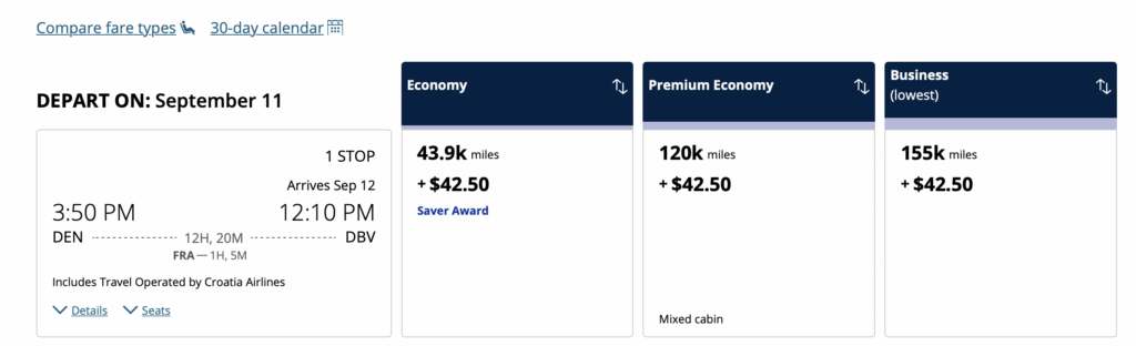 I have honestly had more difficulty finding business class flights on Avianca lately, except when looking for last-minute seats. You can also save with economy seats which are much easier to find. Here is a flight on Avianca’s site followed by the exact same flight on United’s site to go to Dubrovnik from Denver.