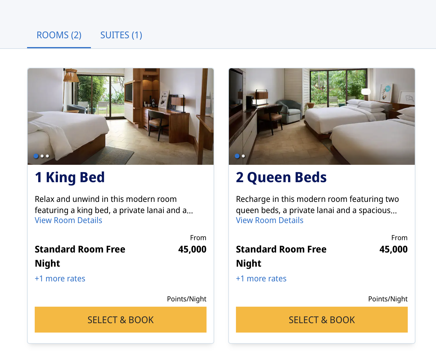 If I want to stay at the Andaz Maui, I can hit the “calendar” button to see when standard rooms are available and the cash price of the rooms. I can then plan my trip around that information. I want to go in February and I can see many options for that redemption. Of course, I have to go to the Hyatt site to confirm my available dates before I transfer any points to Hyatt.