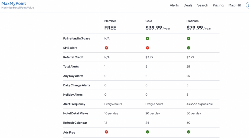 Hyatt doesn’t have a calendar that shows availability, so we primarily depend on using MaxMyPoint to find nights available for hotel points redemptions with Hyatt. Setting alerts with the other hotel programs is also a key part of how we book those popular, hard-to-find standard award nights. We find the pricing for MaxMyPoint to be reasonable and well worth it to help us find the redemptions we are looking for.