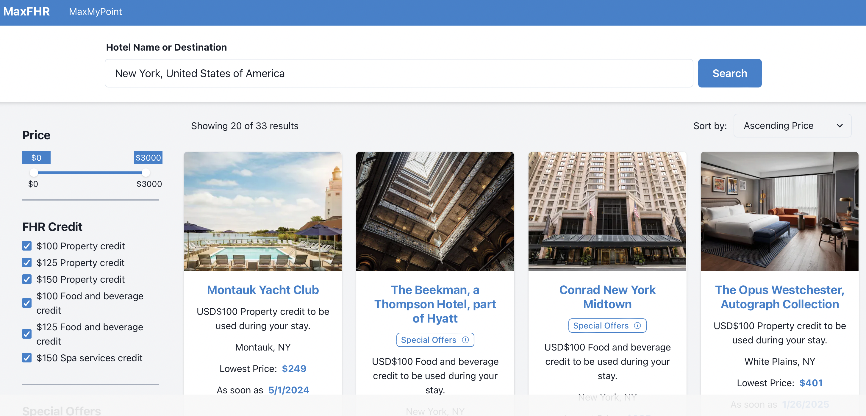 MaxMyPoint has a feature where you can search options for using that credit. I prefer to find a hotel that costs around $300 so that it is nearly free with my credit and the additional benefits. In this case, I’m looking at what is available for a stay in New York City.